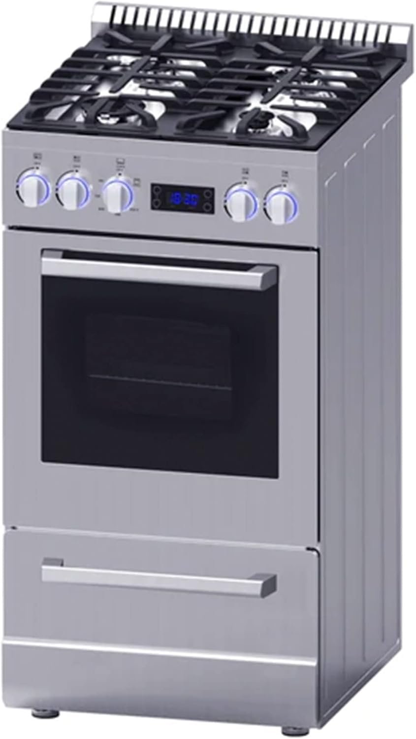 The Avanti ELITE Series 20-Inch Gas Range Oven is the perfect solution for small kitchens, studio apartments, RVs, and vacation homes. Designed for efficiency and style, this compact range features a 2.1 cu. ft. oven capacity and a stainless steel cooktop with 4 sealed burners (1 rapid, 2 regular, and 1 simmer) supported by durable cast iron pan supports. The oven includes 2 racks, a broiler with a pan, and a soft-close roll-out storage drawer for added functionality. Its sleek design is enhanced by 5 LED backlit control knobs, a digital timer/clock, and a seamless framed glass oven door. With additional features like an LP conversion kit, anti-tip brackets, ADA compliance, and a 2-Year Manufacturer Limited Warranty, this gas range is a versatile and stylish addition to any compact kitchen.