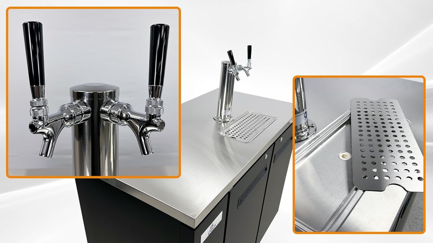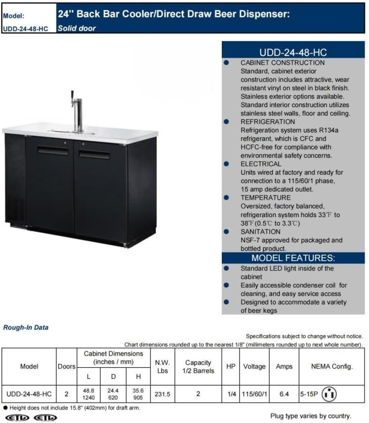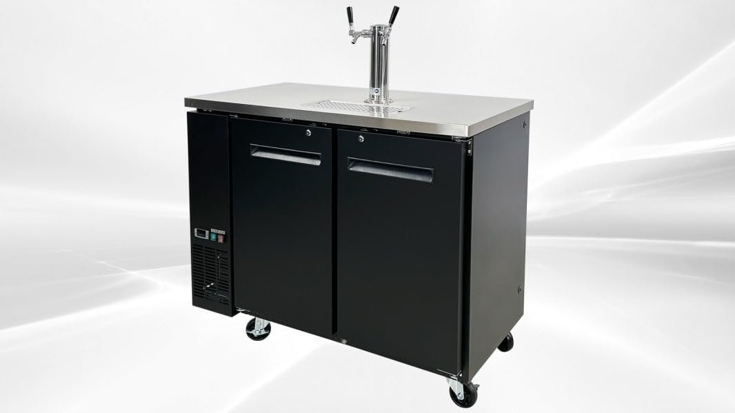Versatile and User-Friendly: Ideal for commercial kitchens, restaurants, cafes, bakeries, bars, offices; Capacity: 2 half Barrels; 2 tap towers included with 2 taps each; Cabinet Construction Note: our warranty does not cover all equipment used in food trucks, trailers, boats, residential addresses, islands, or built-in decorations.