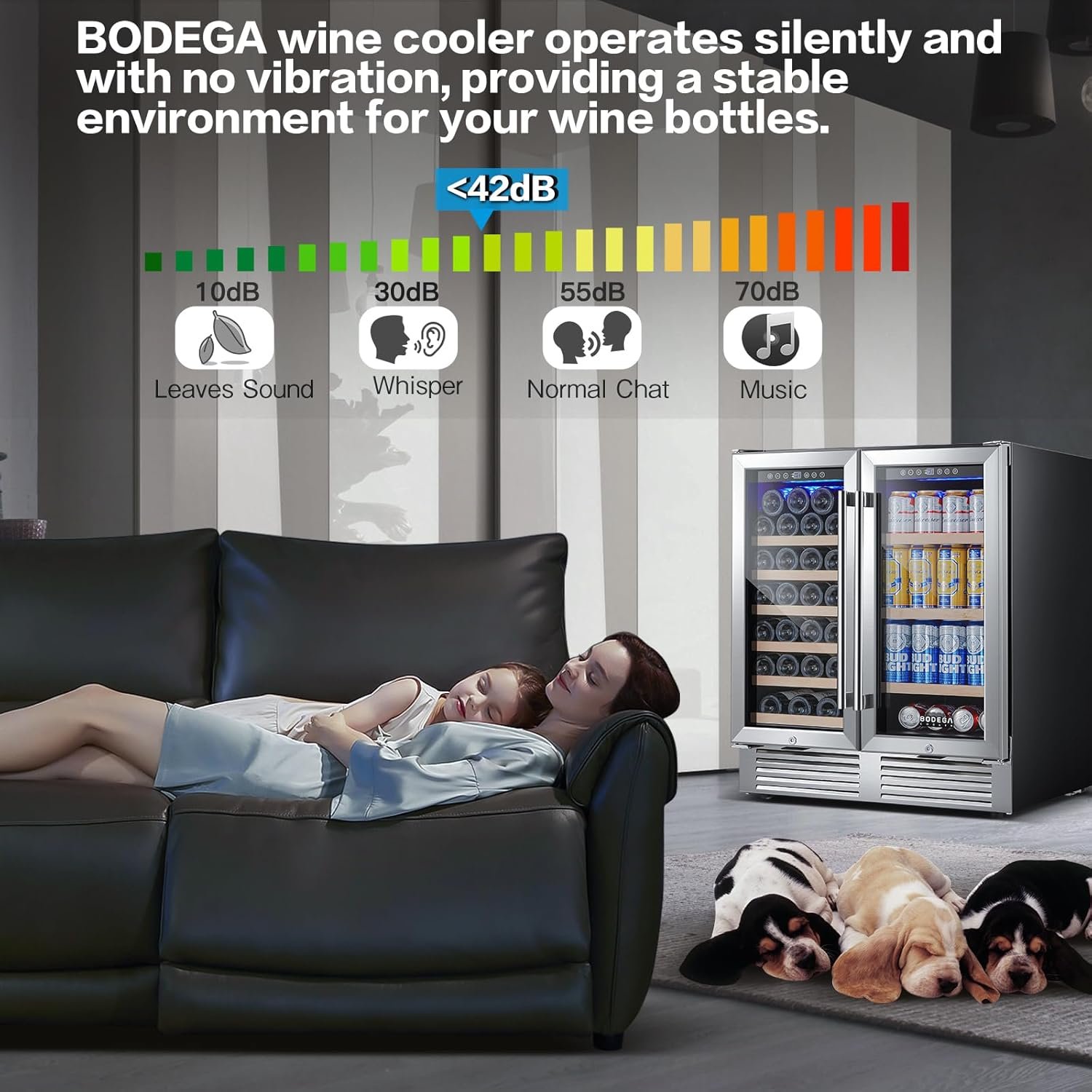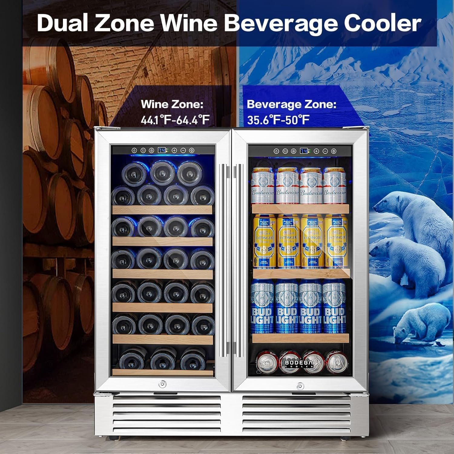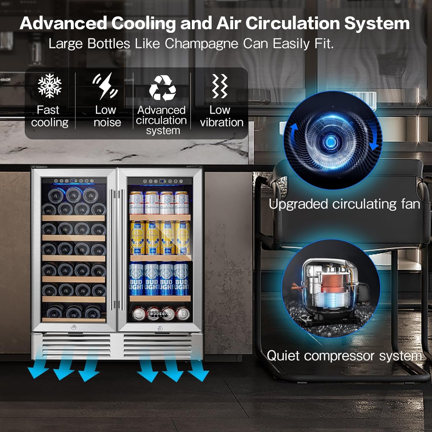 🍷【Intelligent Temperature Control System 】BODEGA 30 inch wine and beverage refrigerator is equipped with advanced sensors and smart chips to precisely regulate temperature and humidity. It keeps the interior of the 30 inch wine cooler refrigerator in a suitable and stable state without major fluctuations, perfectly maintaining the taste of wine and beverage. It is also perfect for use as an under counter back bar fridge.