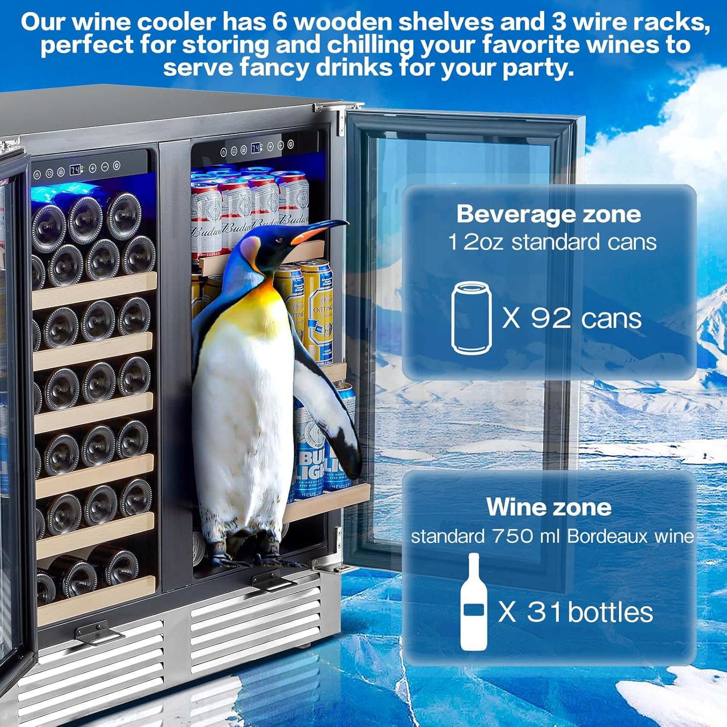 🍷【Personalized Storage Model 】 This 30 inch wine and beverage refrigerator can hold up to 31 bottles of wine (standard 750 ml Bordeaux) and approximately 92 cans of various beverages. Also preset with multiple storage modes, the adjustable shelves are designed to allow you to customize the amount of storage to meet individual storage preferences.The size of the commercial back bar cooler is 22.6″D x 30″W x 34.2″H.
