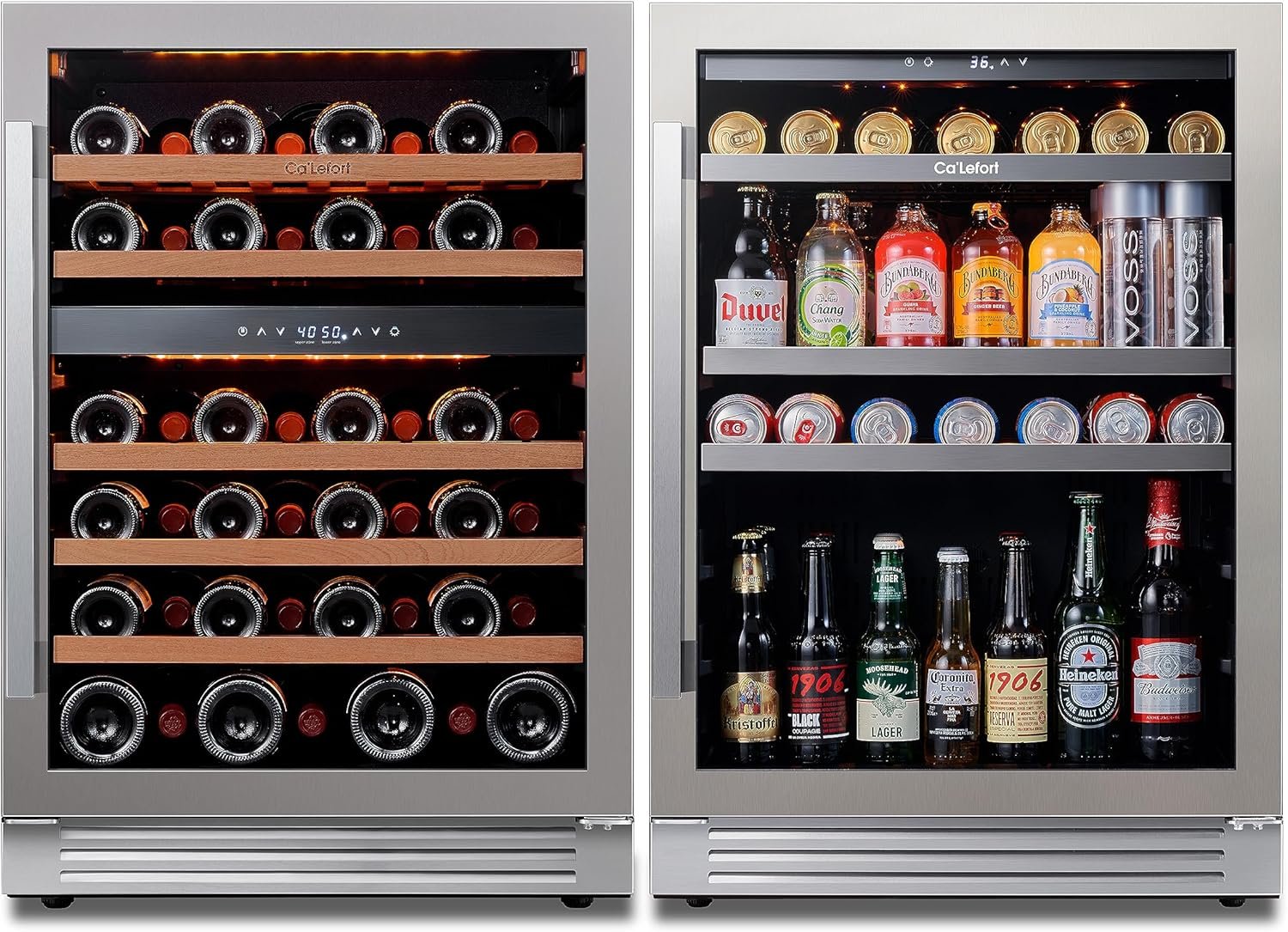 【2 PACK Beverage & Wine Fridge Bundle】Enhance your home bar with our 24″ beverage fridge and 24″ dual zone wine cooler bundle. The beverage fridge offers a 35-54°F range, perfect for chilling sodas, beers, and more. The wine cooler operates at 40-65°F, ensuring your wine collection stays at its best. This duo is ideal for wine enthusiasts, keeping all your favorite drinks at optimal temperatures. Elevate your space with this perfect pairing!