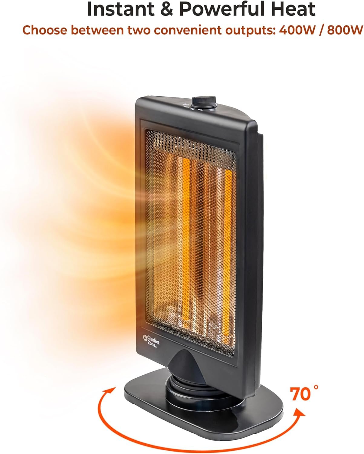 The halogen electric heater features two different heat settings. Switch between them by simply turning a knob at the top of the unit. The same knob also turns the oscillation function on and off. The oscillation setting rotates the quartz heater up to 70 degrees, helping to disperse warmth evenly throughout the room. Sleek Modern Design
