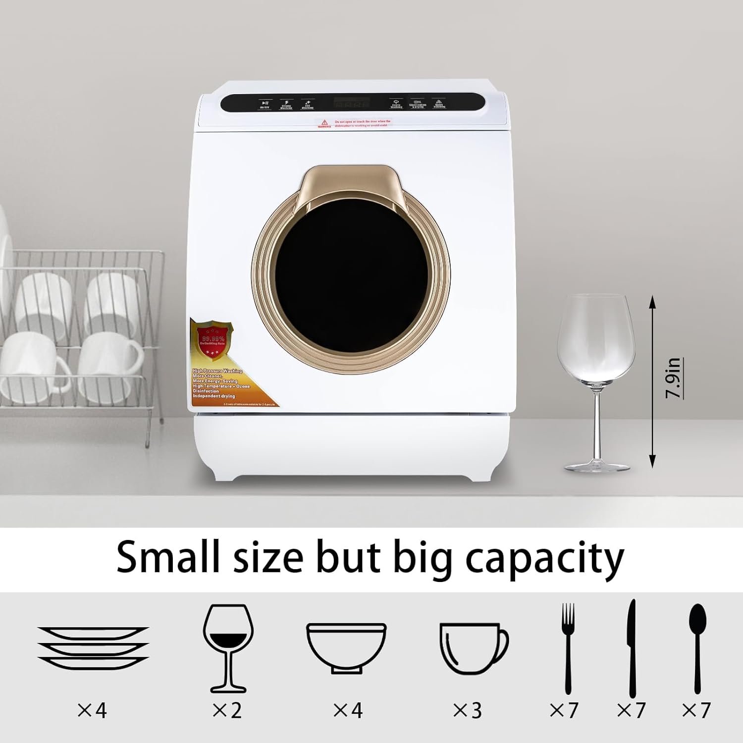Countertop Portable Dishwasher – 7L Built-in Water Tank, No Hookup Needed, 5 Wash Programs, 360° Dual Spray Arms, Air-Dry Function, Compact Design for Apartments and RVs, Energy Efficient, White