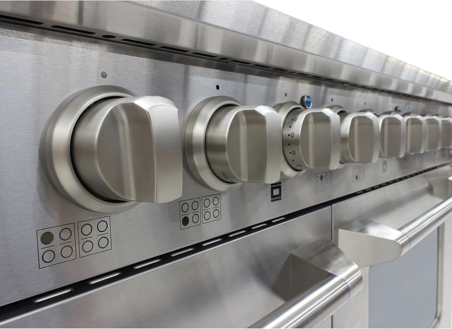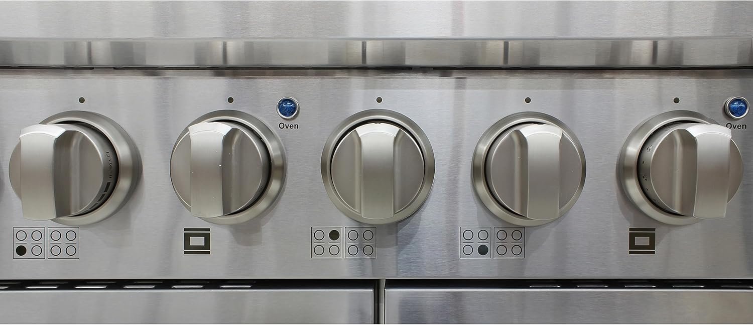LOADED WITH FEATURES: Featuring large knobs, dual burner, continuous grates, 8 sealed burners, 3.5 and 2 cu. ft. oven capacity, blue porcelain oven, oven light, stainless steel drip pan, and a sleek industrial size pole handle. Product Dimensions: 48″ (W) x 28.75″ (D), 38″ (H). Electrical requirements: 120V / 60Hz / 20Amp