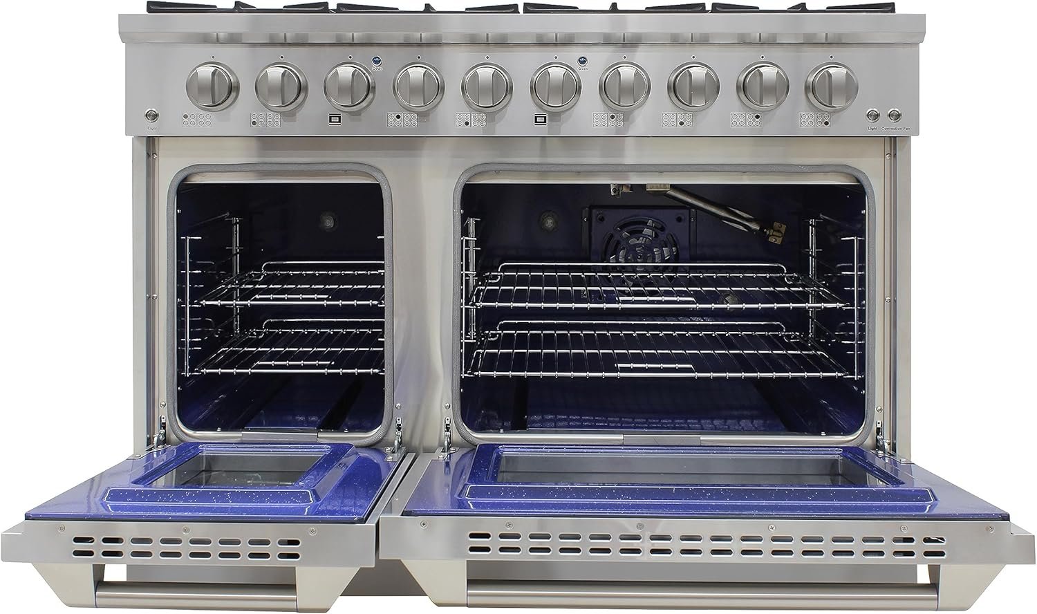 Show off your kitchen with this beautiful DUURA Elite® 48-Inch Double Oven Gas Range. The modern styling of this compact stainless gas oven will be a perfect fit for smaller spaces. Features of this unit include large knobs, dual burner, continuous grates, eight sealed burners, 3.5 and 2 cu. ft. oven capacities, blue porcelain oven, stainless steel drip pan and a sleek industrial size pole handle. The convection fan and light switches are on the sides of the control panel, and the oven indicator lights in blue signal that you left both ovens on. Designed for indoor use, this oven makes a perfect addition to any kitchen space!