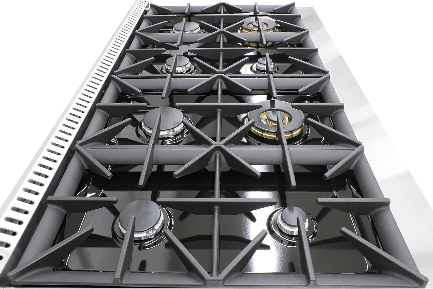 8 SEALED BURNERS: High performance gas burners which allow you to cook from a high heat for boiling, frying or searing to a low simmer for the most delicate sauces, Auxiliary burner 2 x 6,000 BTU, Semi-rapid burner 2 x 9,000 BTU, Rapid burner 2 x 12,000 BTU, and Triple crown burner 2 x 20,000 BTU
