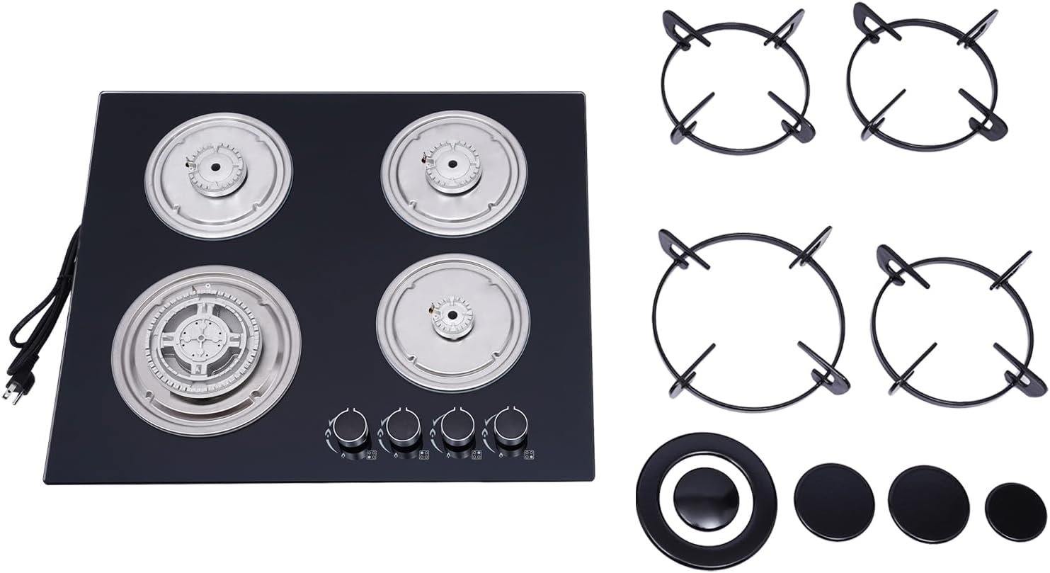 Simple Installation: With the simple structure and complete installation parts, you just need to connect the gas tank(not included) to the appliance after simple assembly or connect to natural gas using the supplied natural gas nozzle, which is convenient and time-savingClear Marks: The ignition knobs all have a small mark next to them to make it easier for you to distinguish between using the corresponding burnersSpecification: Color: BlackMartial: Cast Iron, Stainless Steel and Tempered GlassProcess: PolishingAssembly Required: YesIs Dishwasher Safe: NoShape: RectangularFuel Type: GasNumber of Burners: 4Power Source: Gas Powered Plug Type: US StandardInstallation: Built-InGas Type: LPG.(with Adapter)Type: Gas CooktopsPressure: 2800PaVoltage: 110VMain Burner Heat Input: 1*130mm/5.12in*3.3kw, 1*75mm/2.95in*1.75kw, 1*55mm/2.17in*1.0kw, 1*100mm/3.94in*2.6kwTempered Glass Panel Dimention: 59*51cm/23*20 inCut-out Size: 55.5*47.5cm/21.85*18.7 inchPackage Size: 66*58*17cm/26*22.83*6.7 inchGross Weight: 12kg/26.46lbsPackage Included: 1 * 4 Burner Gas Cooktops 1 * English Operation InstructionOther Accessories for UseNotes: 1.Please note that this product does not include food, cooking pots or gas canisters.2.The product is factory-set for liquefied petroleum gas, with a natural gas nozzle, you need to remove and replace the nozzle3.Please read the English operation instruction carefully before use and pay special attention to the safety instructions therein.4.Please allow the slight color difference caused by the shooting light and the 1-3cm error due to manual measurement, and make sure you do not mind before ordering