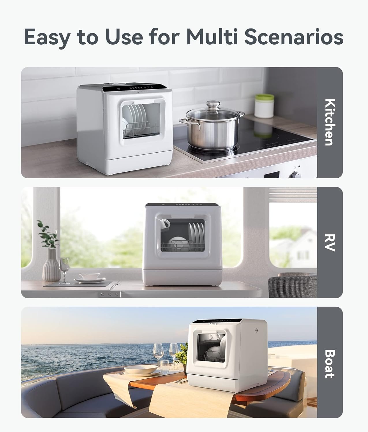 Compact and Convenient: Measuring 16.85 × 16.73 × 18.03 inches, the ecozy portable countertop dishwasher is perfect for families (ideal for 1-3 people), apartments, RVs, boats, camping, and more. It’s large enough to accommodate a wide range of dishes of all sizes, but small enough to go wherever you need