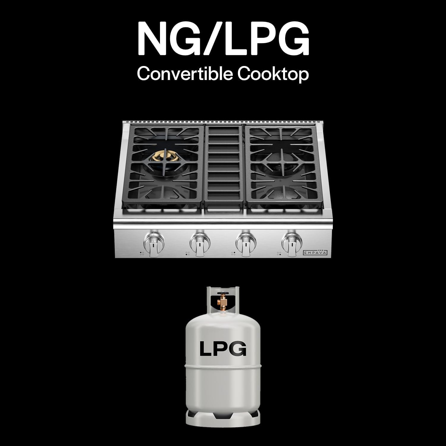 Now you are cooking! Enjoy all these features even more by knowing this gas range top cooktop. Product dimensions: 30 in. W x 28.38 in. D x 8.72 in. H. Cutout dimensions: 30.12 in. W x 24.77 in. D x 7.3 in. H. Pre-installed for natural gas (gas regulator included), can be converted to liquid propane gas use (LPG conversion kit not included). Pre-installed US standard 120v GFCI power cord (electric ignitor), 15 amps breaker required.