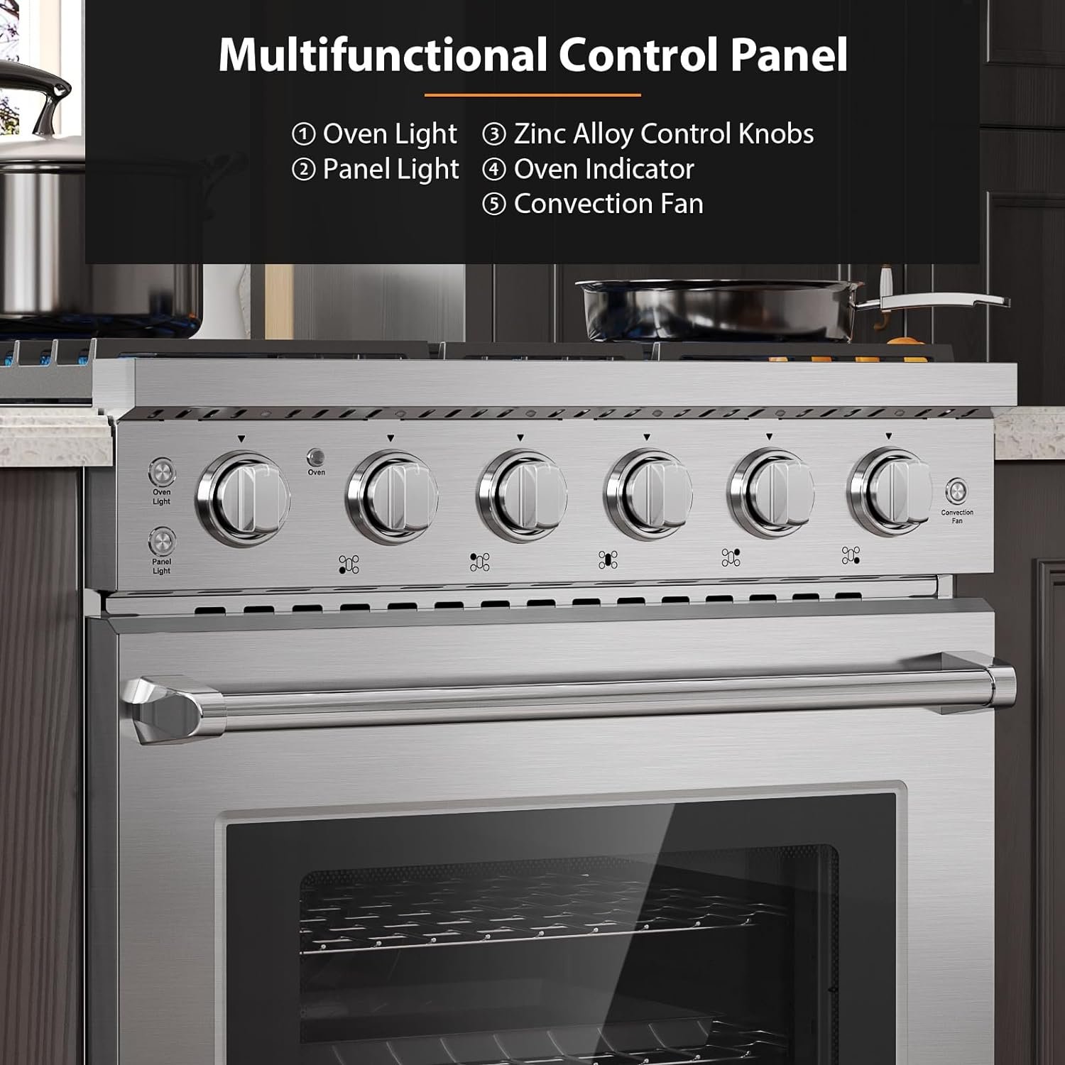 SIZE & WARRANTY – Please verify the gas range is the right size that you need. Product size: 30 in. W x 27.6 in. D x 36.3 in. H; Built-in size: 34 in. W x 26.4 in. D x 36 in. H; With 2 Years US Based Manufacturer Warranty. Pre-installed for natural gas (gas regulator included), Can be converted to liquid propane gas use (LPG conversion nozzles included). Pre-installed US standard 120v power cord (electric ignitor)