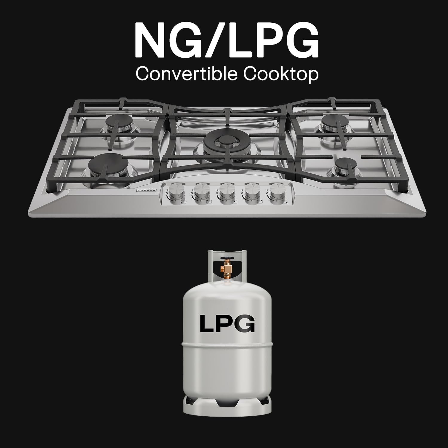 LPG/NG Convertible (Both Nozzles Included) delivers the same maximum BTU power to propane and natural gas cooktops – Works manually w/o electricity. Capable for multi-purpose such as RVs, light cooking family, small kitchen, mobile home and outdoor use, etc. Compatible to install above any Empava’s 24/30 in. under-counter single wall oven