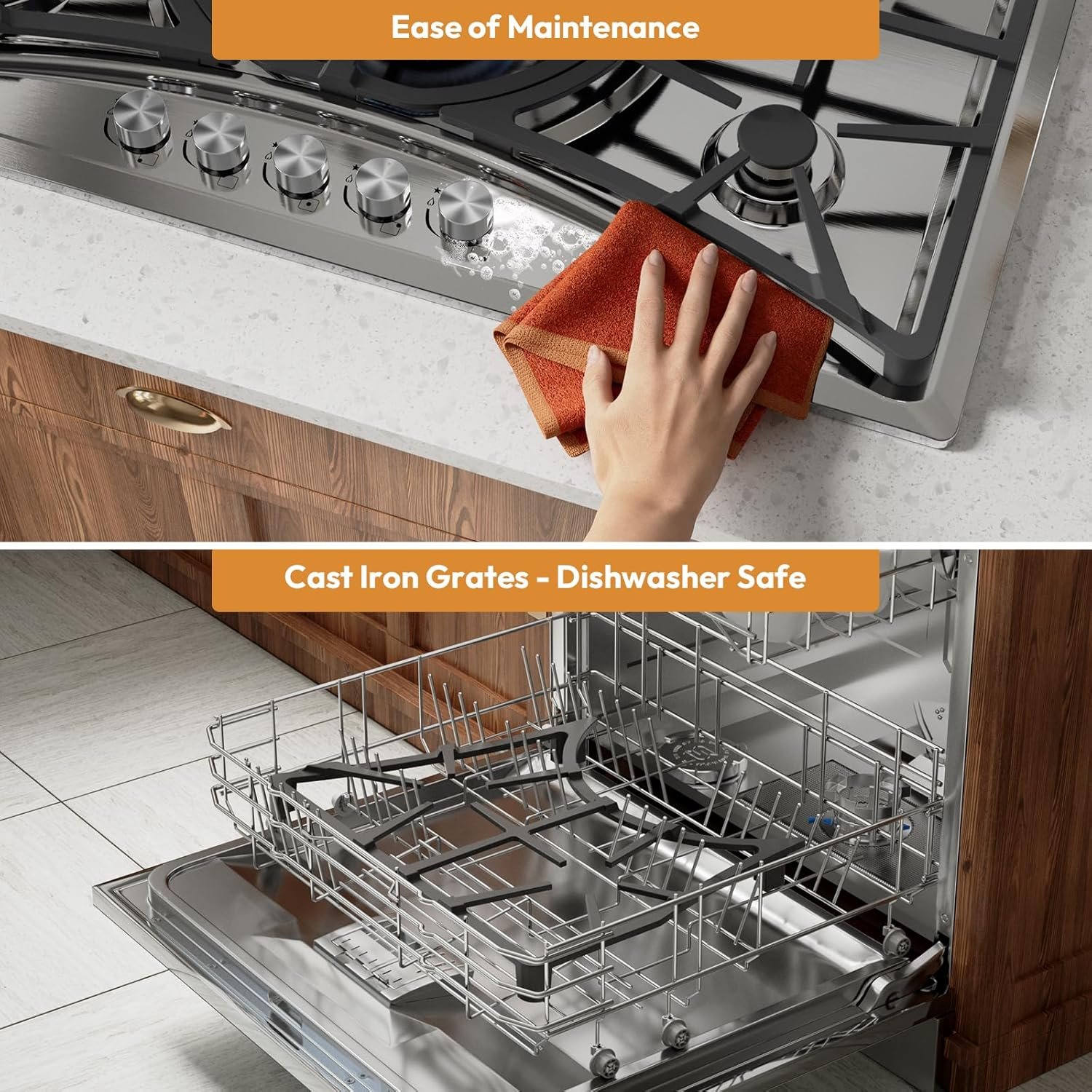 The durable knobs and laser cut full-width edge-to-edge heavy cast iron grates can be cleaned in the dishwasher for hassle-free, effortless cleaning and maintenance to enhance the premium look.