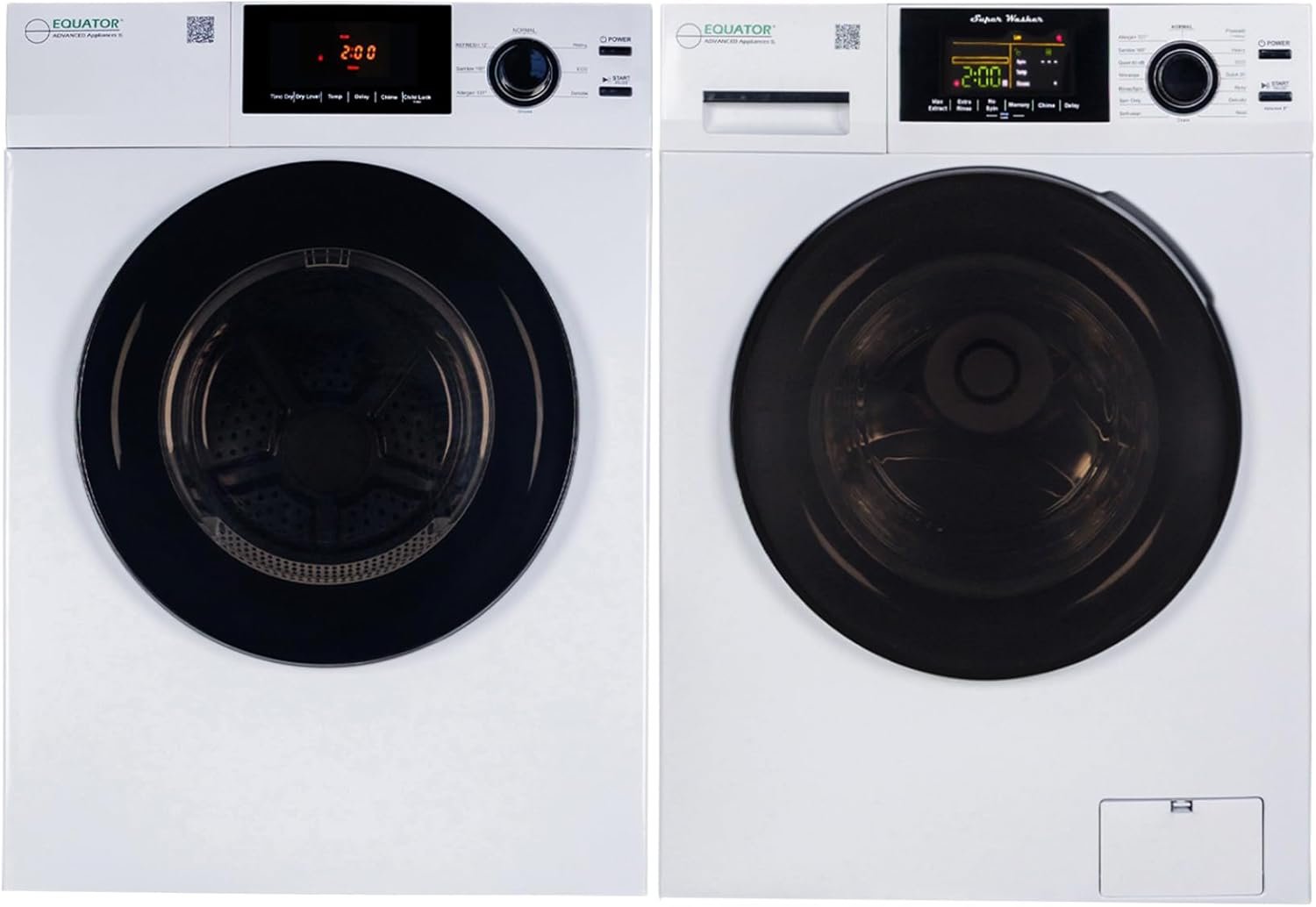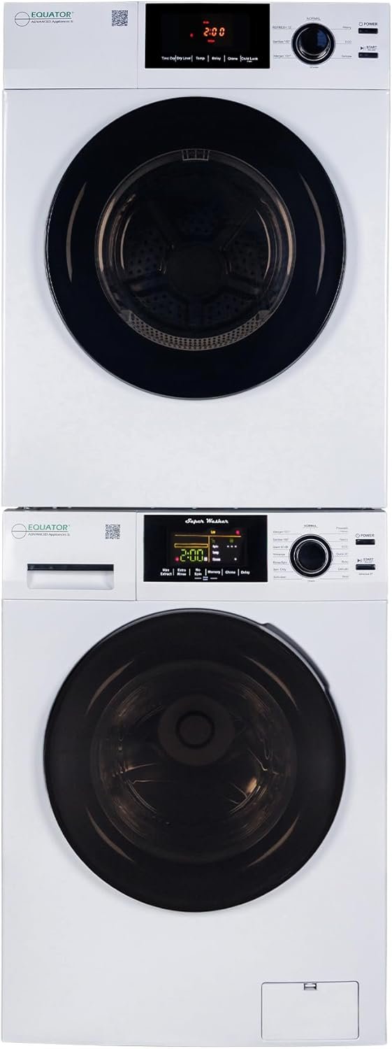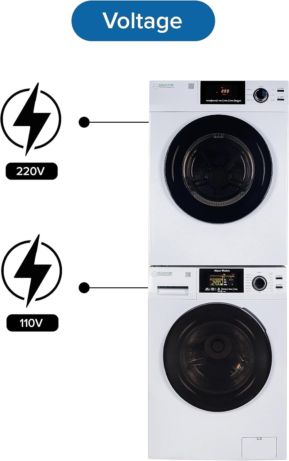 Harness the innovation and complementary features that are built into the Equator 1.9 cu. ft. Super Washer and the Equator 4 cu. ft. 220 Volt Vented Dryer. Equator’s laundry center designed to work in harmony to bring out the best in your clothing, bedding, towels, and other fabrics, each appliance has an array of settings from which you can select. The EW 835 washer measures 33.5 x 23.5 x 24.8 (HxWxD in inches), while the ED 880 dryer measures 33.5 x 23.6 x 25.2 (HxWxD in inches).The sleek, stackable vented Dryer boasts a variety of innovative features, all in a design just a fraction of the size of typical dryers. If desired, these compact appliances can be stacked for added space savings.Washing and Drying can be done at the same time since both units are separate. The Super Washer comes with features like four memory programs, a color coded LED display, adjustable legs, Winterize setting, and 11 wash cycles (including ECO, Prewash, Baby, and more) along with Max Extract and Automatic Water Level.. The ED 880 Vented Dryer also has a long list of premium features, including Sensor Dry capabilities, eight dry cycles (featuring Delicate, Normal, Shoes, etc), included exhaust elbow and hose, a reversible door, a clean lint filter reminder function, and a Refresh setting.