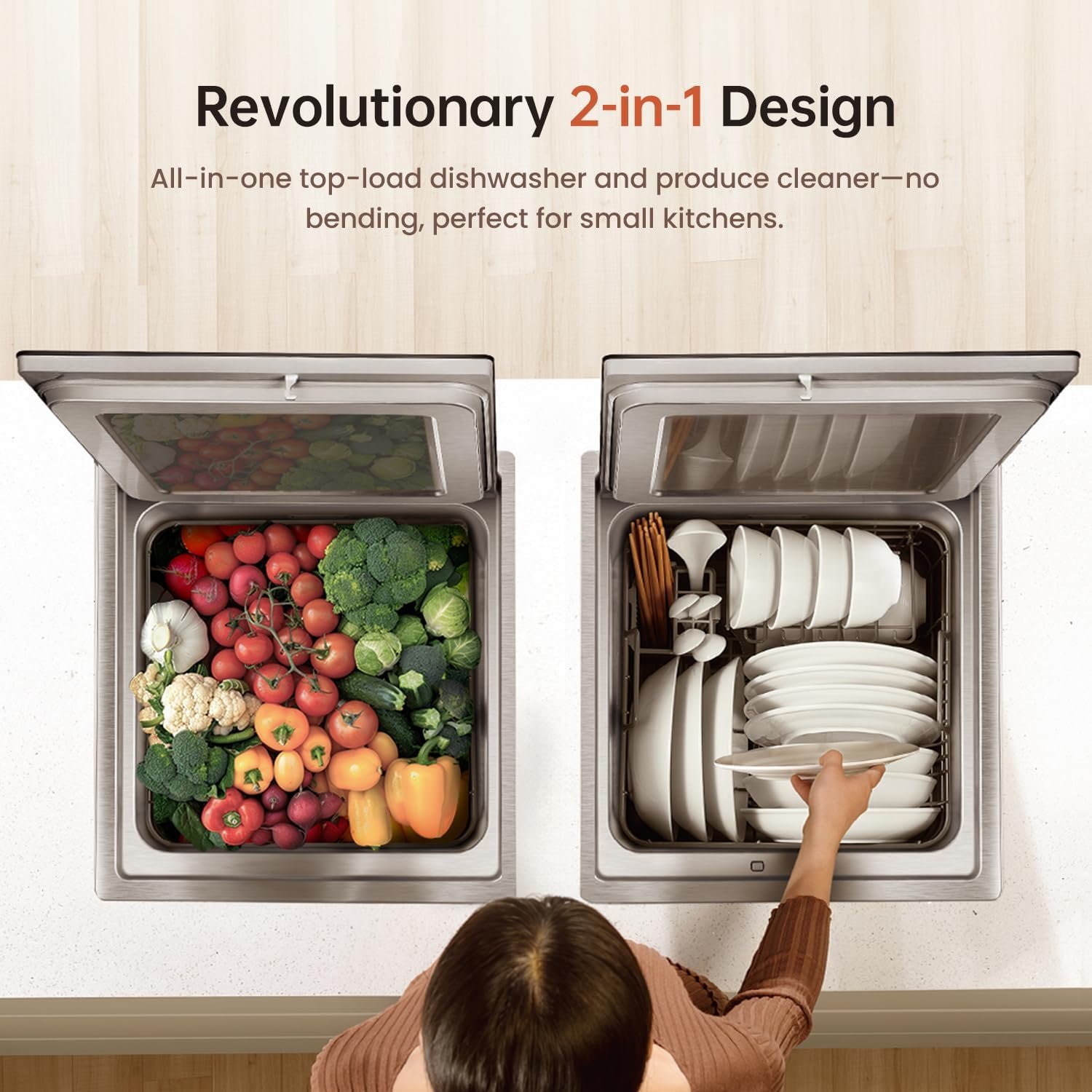 Revolutionary 2-in-1 Design: Combines a top-load dishwasher and produce cleaner in one compact unit, eliminating the need to bend over and making it perfect for small kitchens and tight spaces.