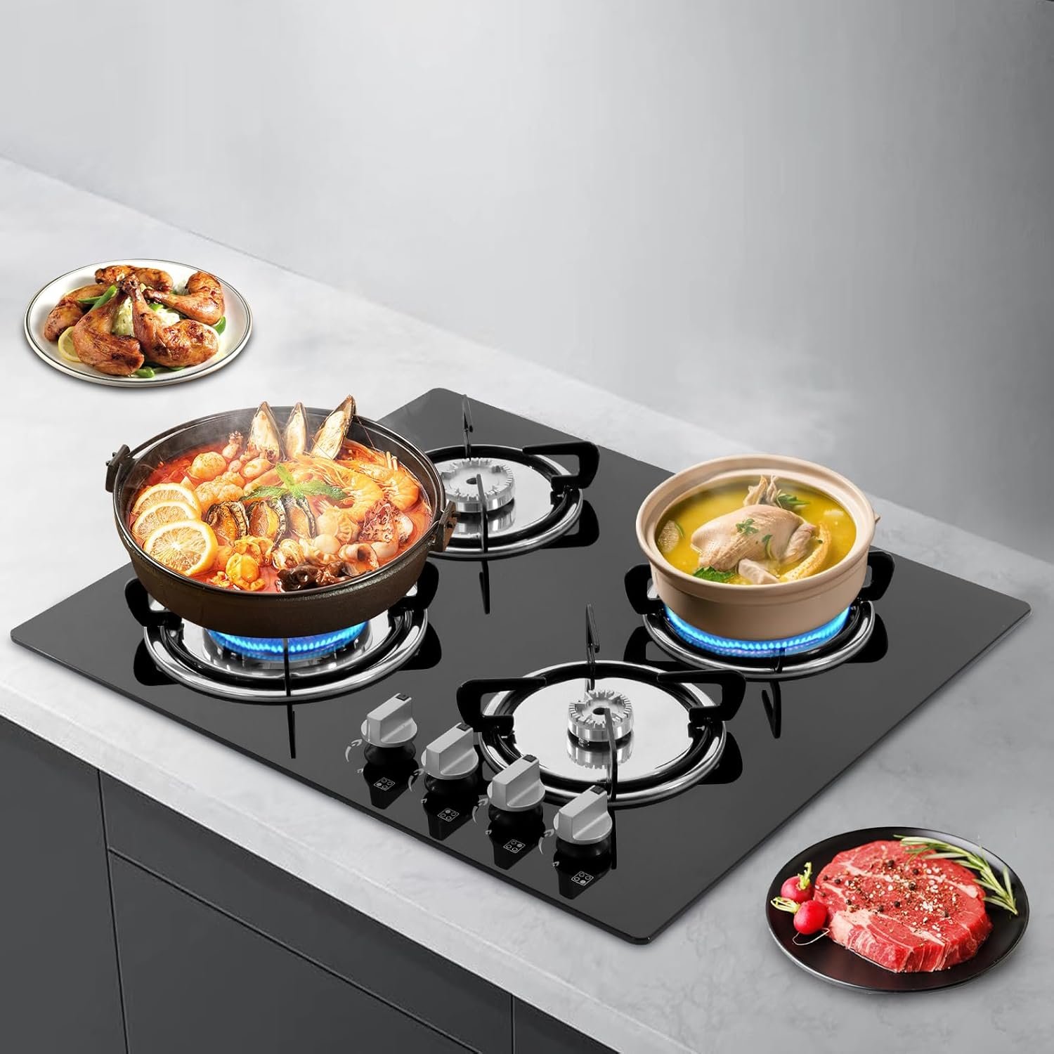 ✔【Efficient Cooking】Four independent burners have strong firepower and can cook multiple dishes simultaneously, greatly improving cooking efficiency;The gas stove uses electronic pulse ignition, and you only need to press and rotate the knob switch to quickly complete the ignition.