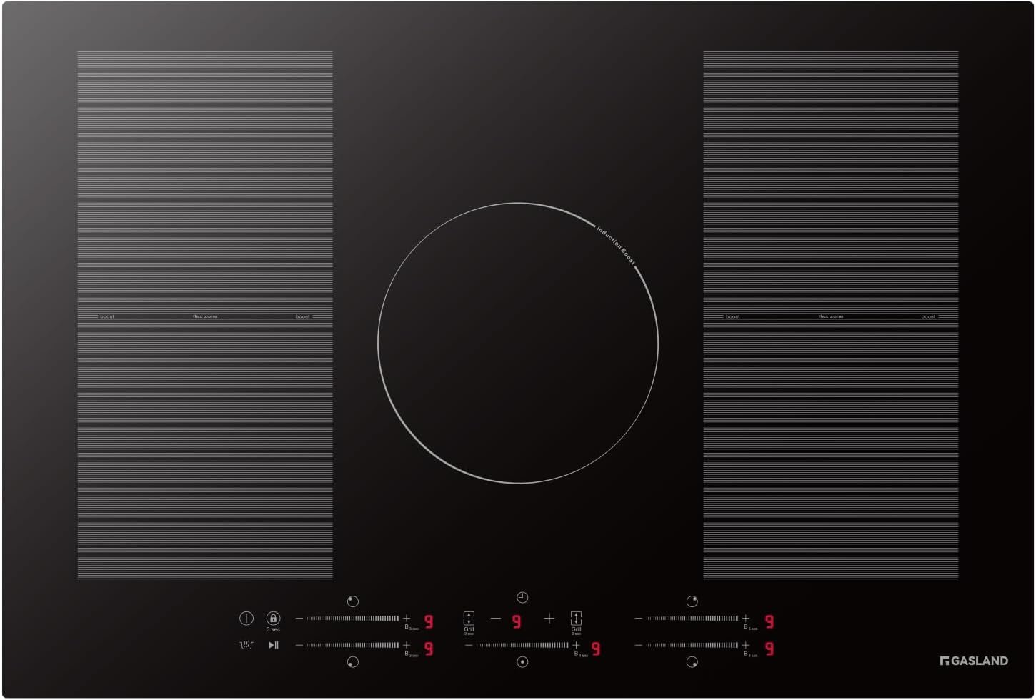 Cooktop Type Induction Cooktop Control Type Slide and Touch Control Surface Type Crtystal Glass Plate Heating Elements 5 Features Induction Cooktop, 9 Power Levels, Booster, BBQ Function, Keep Warm Setting, Adjustable Temperature, Timer, Child Safety Lock, Hot Surface Indicator, Overheat Protection, Auto Shut-Off, Easy to Clean Volts 220~240V Frequency 50/60Hz Package Contents Induction Cooktop, Installation Kit and User Manual Left Front Zone Power 7.1″x 7.1″ ( 2000W/2600W) Left Rear Zone Power 7.1″x 7.1″ (1500W/2000W) Middle Zone Power 8.3″ (2000W/2600W) Right Front Zone Power 7.1″x 7.1″ (1500W/2000W) Right Rear Zone Power 7.1″x 7.1″ (2000W/2600W) Product Size (Inches) 30.4″x20.5″x2.4″ Cut-out Size (Inches) 29.2″x19.3″