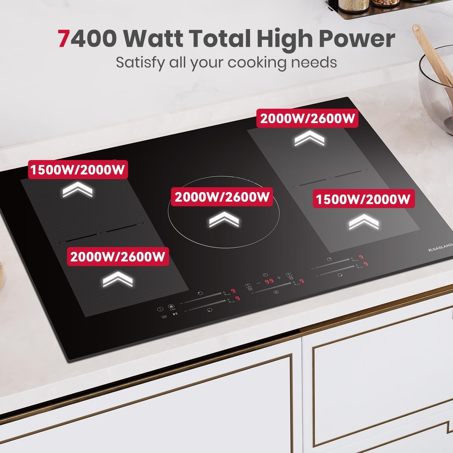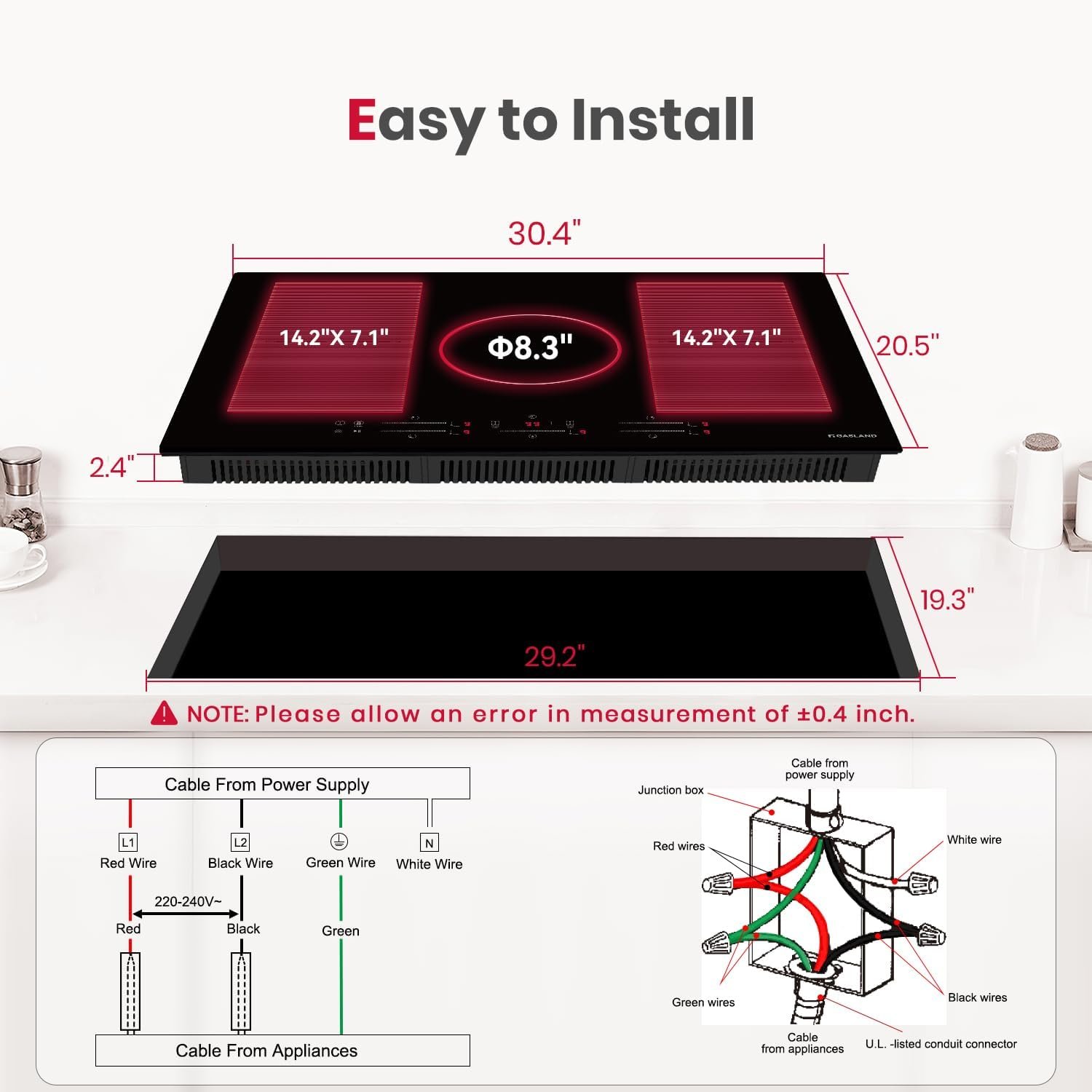 【220-240V Drop-in Induction Cooktop】GASLAND built-in induction cooktop is a high power appliance, suitable for 220-240V, there is no plug. Please find a qualified person to install it. Product size: 30.4″ x 20.5″ x2.4″(770mmx520mmx60mm). Cut out size: 29.13″ x 19.29″(740x490mm). All induction cooktops are only compatible with magnetic flat-bottomed pots and pans, which can be tested with a magnet before use.