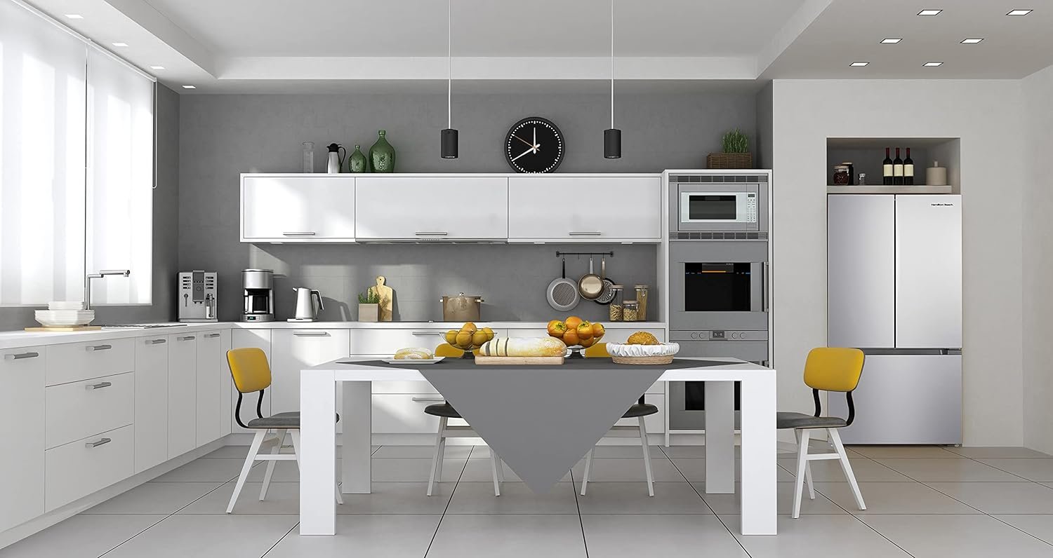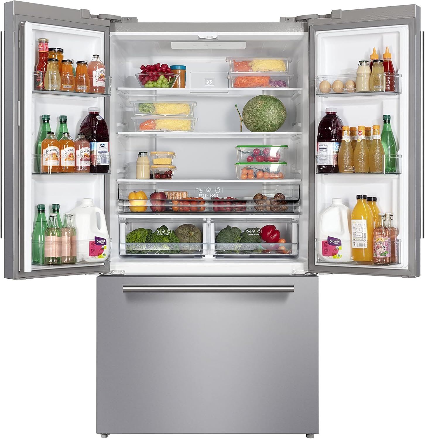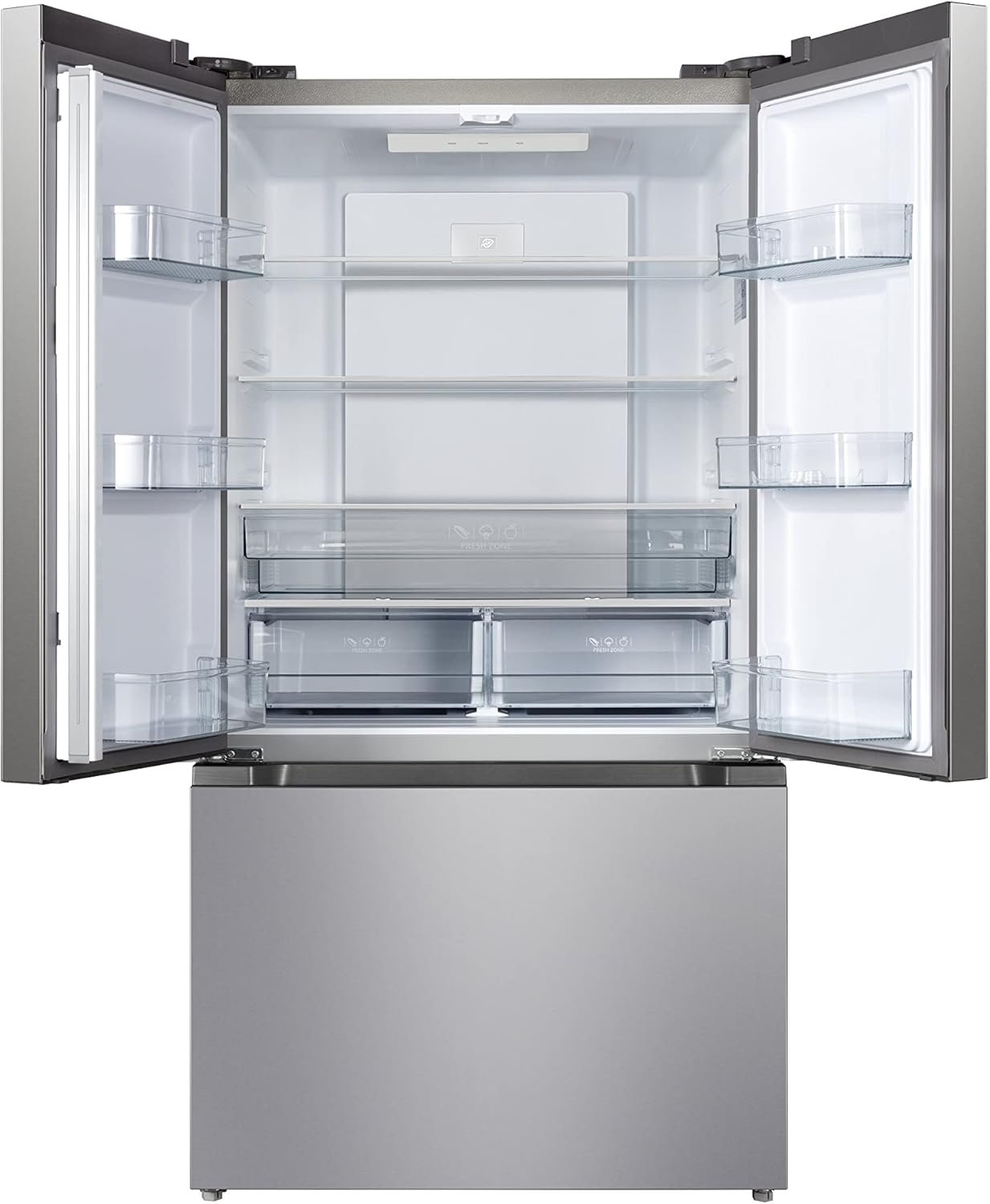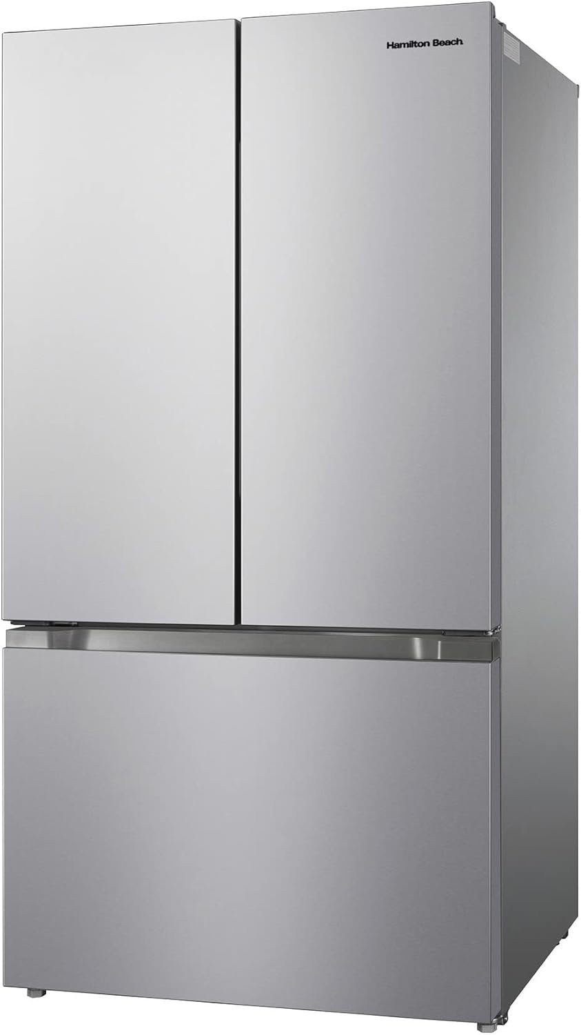 Our modern Refrigerator has a 2 French doors configuration with a refrigerator compartment on top and a freezer with a 2 doors compartment at the bottom. Featuring an adjustable thermostat, a built in lamp, slide out shelves and adjustable feet, This CFC free unit will allow you to easily store your snacks and beverages to keep them fresh at all time.