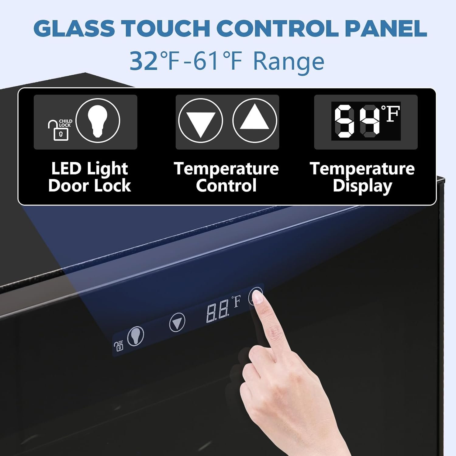 【Smart Touch & Temperature Control】This glass door beverage refrigerator of ours features an easy touch temperature control with digital temperature display ranging from 32°F to 61°F to meet your needs for storing different beverages. If you want to set it to constant temperature mode, set the temperature to your desired value and press the child lock once. If you want to change the temperature again, simply press the child lock 3s to unlock it. It is a good helper for your family!