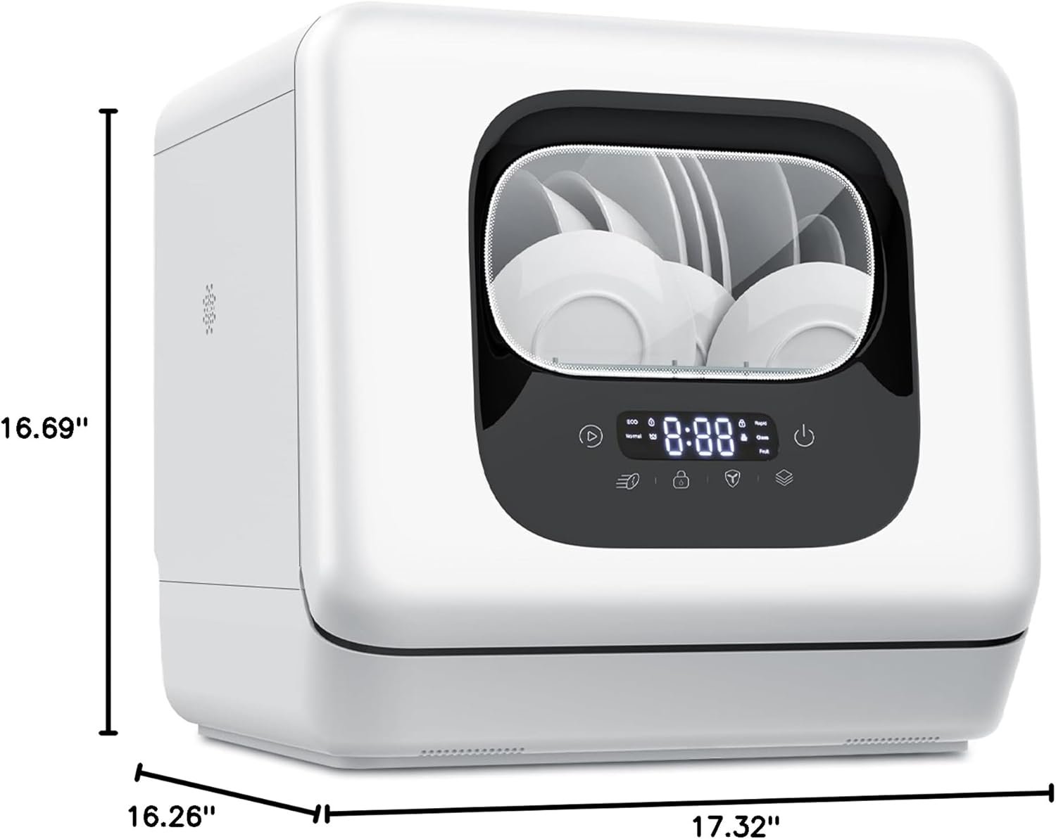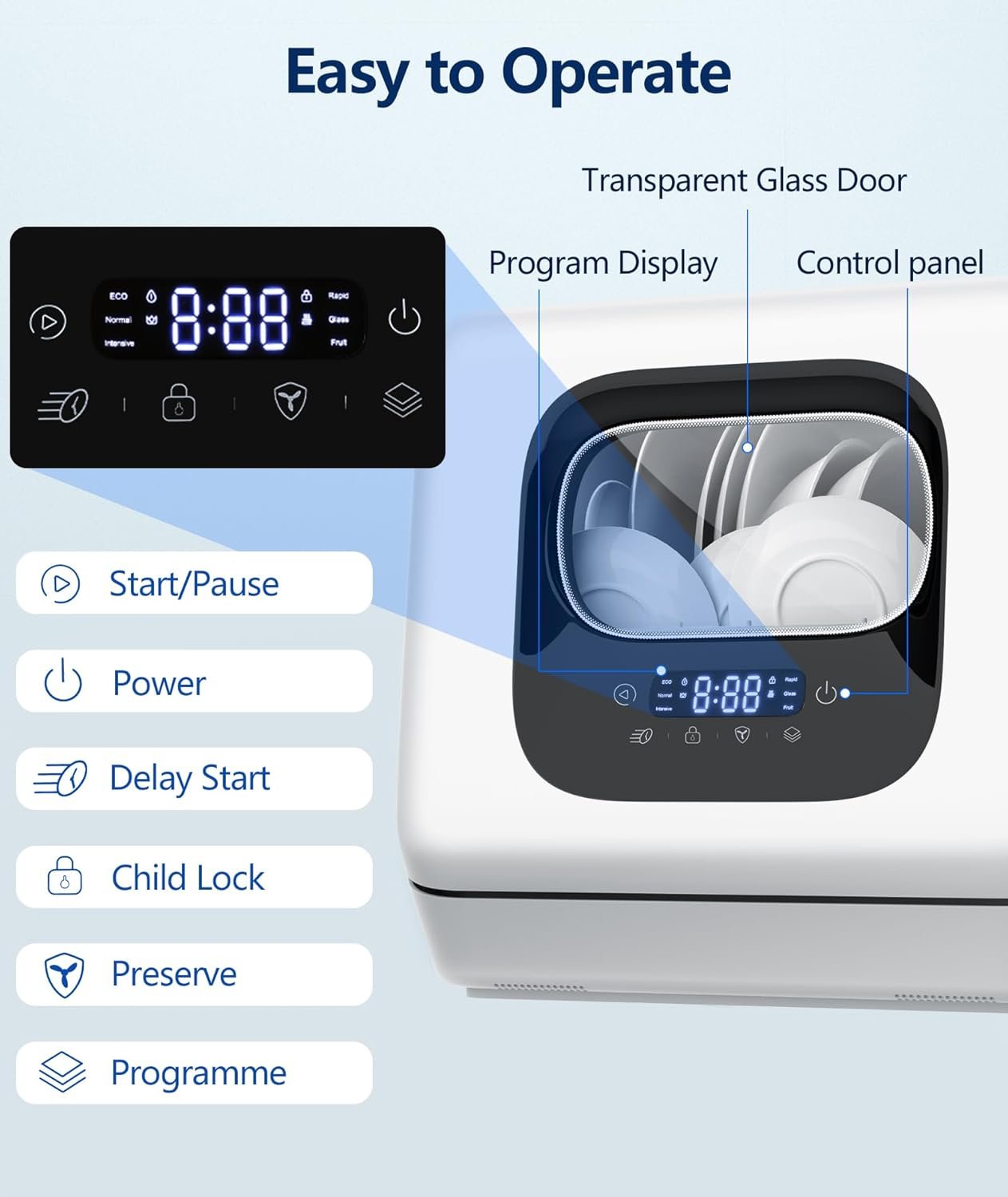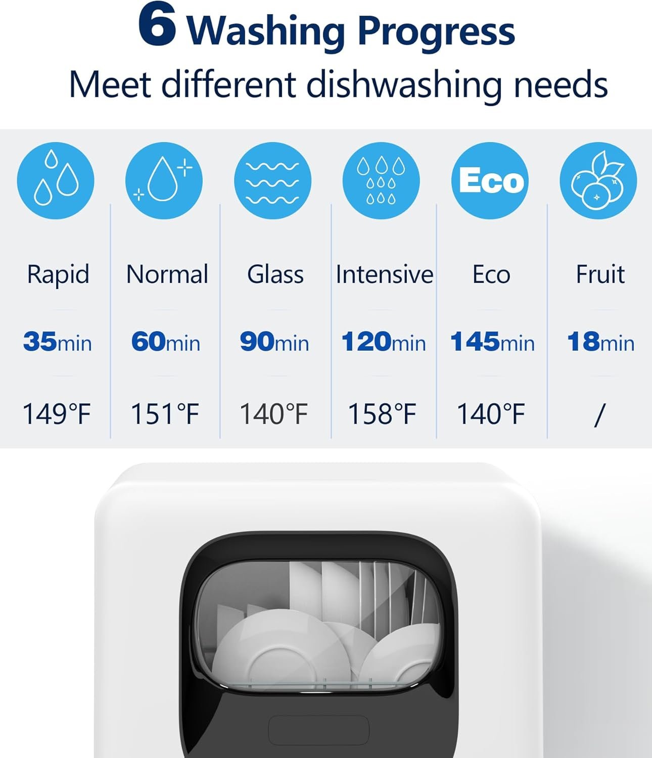 【6 Washing Programs &Smart Touch Screen】:With up to 6 wash programs, Joy Pebble countertop dishwasher allows you to choose the right wash program according to cleaning needs. The water temperature can reach up to 158 °F during the washing process, baby items can be washed without worry. In addition the small dishwasher also features an LED touch screen for clear, easy-to-understand operation.