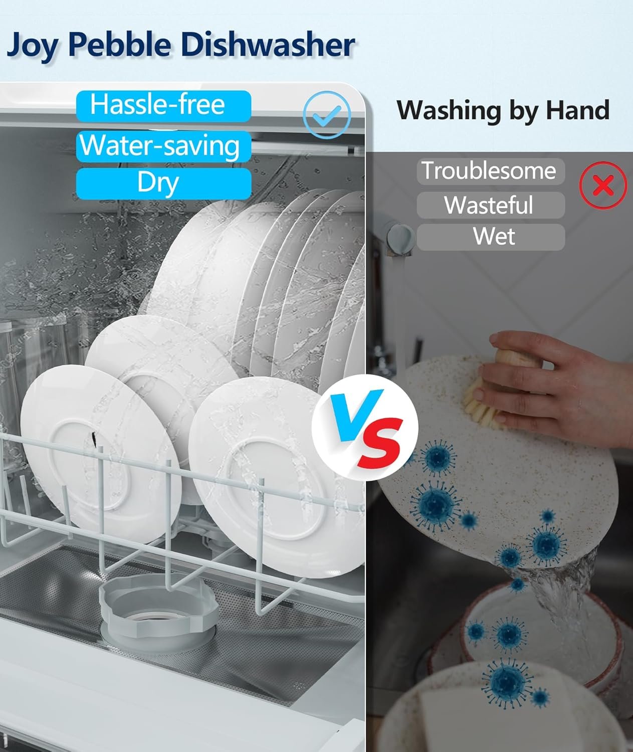 【360°Dual Spray Arm &Note】: Joy Pebble dishwasher’s upper and lower dual spray arms, you can fully clean stains in 360 degrees, so you can free your hands and enjoy your life.Note: Please use a standard dishwasher cleaning powder, regular liquid dish soap can cause the dishwasher to malfunction.