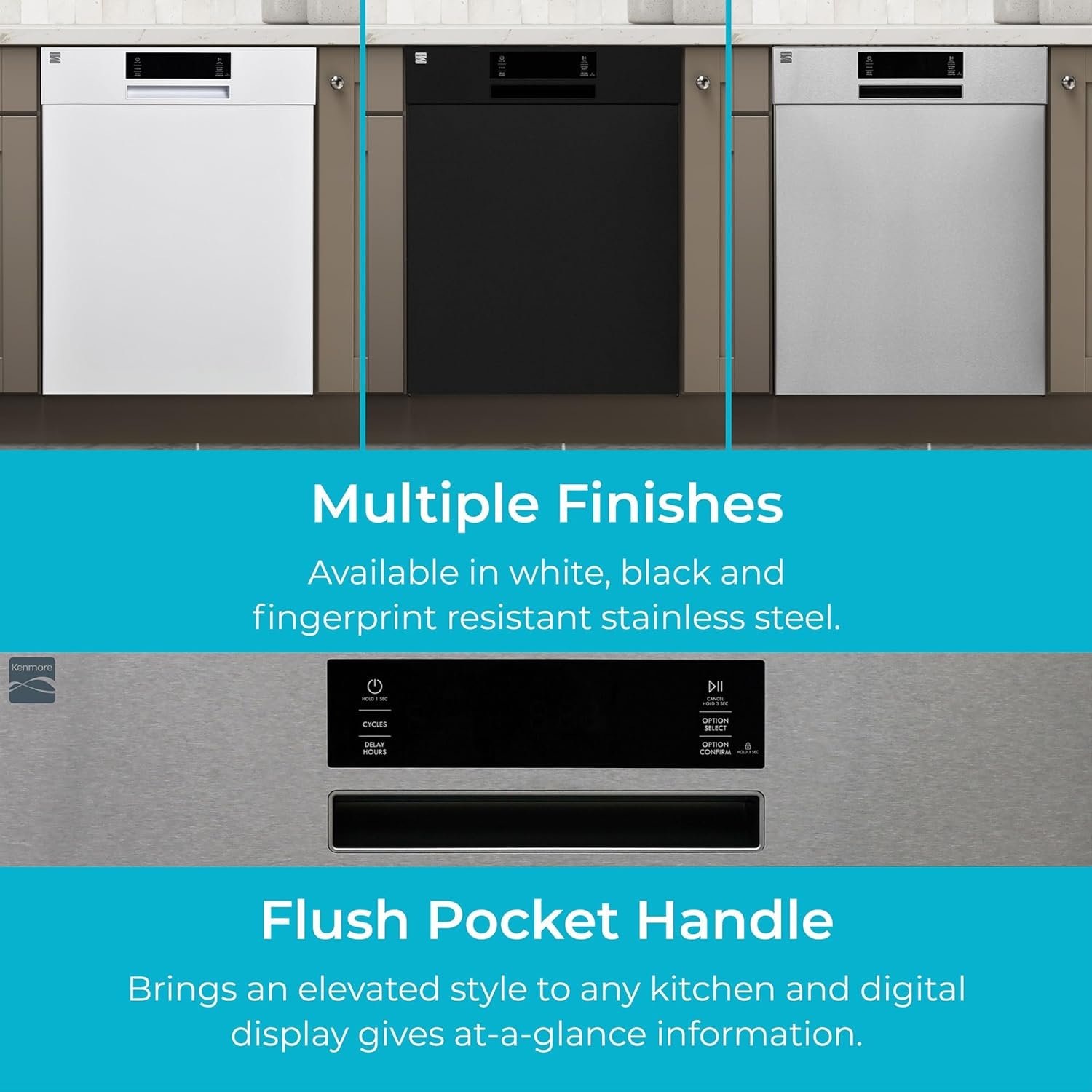 Get the cleaning power your dishes need with the Kenmore Built-In Dishwasher. This 24″ dishwasher makes it easy to get the right wash for your load every time with SmartWash Cycle, which detects the amount of soil in the water and automatically adjusts the temperature, amount of water, and duration of the wash accordingly. Featuring UltraWash and SmartDry systems, this dishwasher uses 2 spray arms while constantly filtering the wash water through the wash cycle and uses hot water to promote the condensation of moisture in the tub for ready-to-use, sparkling clean and dry dishes at the end of the cycle. To ensure problem-free dishwashing, the Leak Detect System conveniently measures and monitors water flow at various points of the cycle. If a problem is sensed, the dishwasher will automatically drain the tub and alert you when necessary. Functional and attractive, the stainless steel tub resists food stains and retains heat for an optimal drying performance each cycle while also making for a stylish addition to any home kitchen. Operating at 57 dBA, this low-noise dishwasher offers ultra-quiet wash cycles to make it easy to enjoy after-dinner chats and clean up around the kitchen, and it’s Energy Star Certified to help you save money while using less energy each cycle.