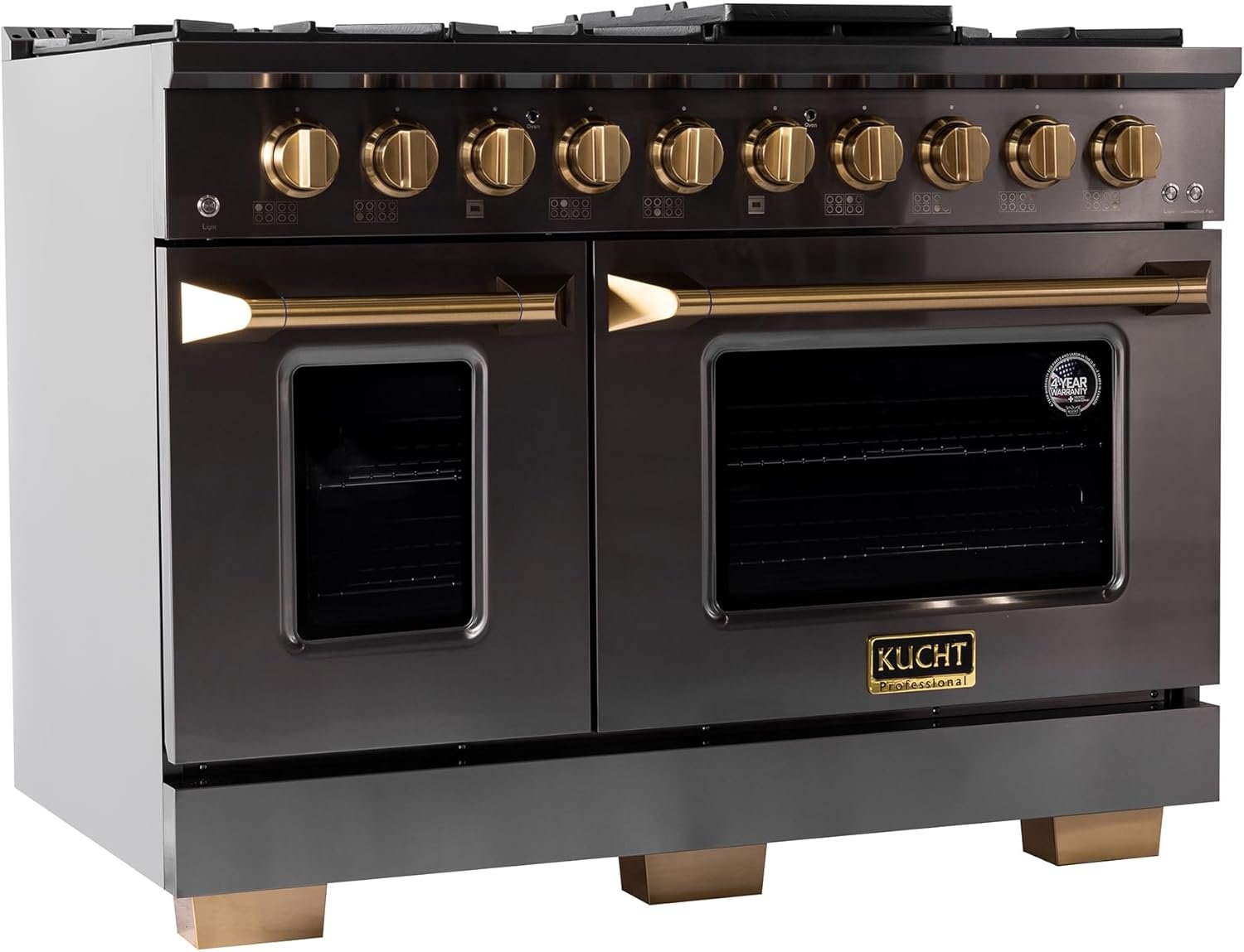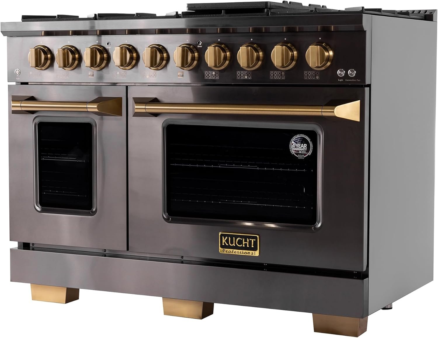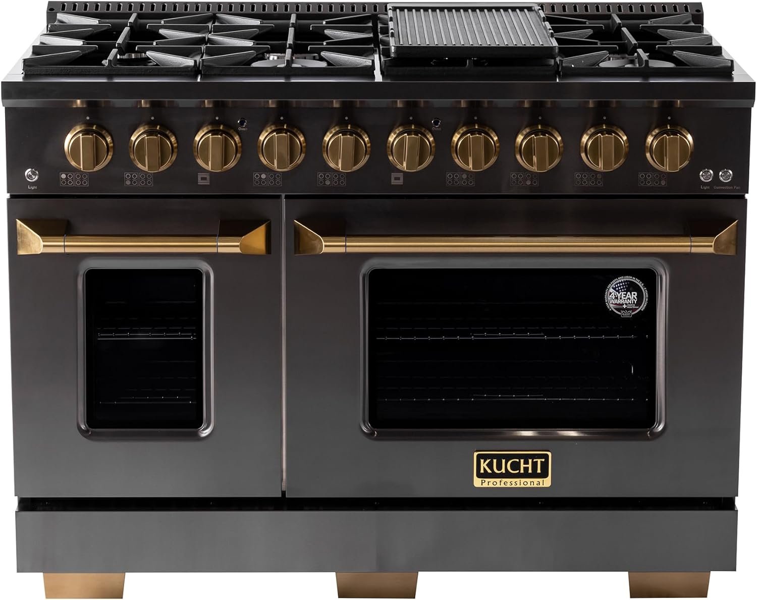 New Kucht Gemstone KEG Series – the epitome of luxury and style in your kitchen! With a sleek, darker stainless steel finish and gold assets, this range will elevate the look of your kitchen to a whole new level. This premium gas range features powerful burners, each manually controlled by gold knobs, allowing you to cook with precision. The heavy-duty cast iron grates provide a sturdy and stable surface for all your pots and pans, while the spacious oven offers plenty of room for baking, and roasting your favorite dishes. The shorter kickplate design unveils a fancy set of squared gold legs, matching the knobs and the handle. But it’s not just about the looks and performance – the Kucht KEG series is also built to last. Made with high-quality materials and designed to withstand the rigors of daily use, this range will be a reliable and durable addition to your kitchen for years to come.