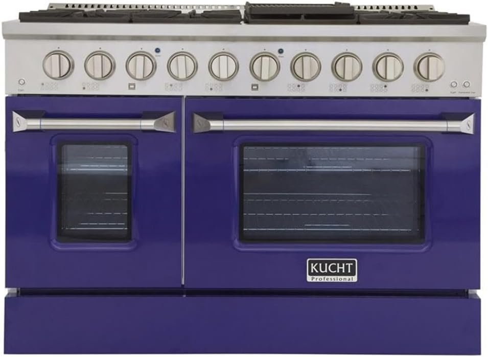 As with all Kucht ranges, the attention to detail coupled with old-world craftsmanship will transform your present home cooking area into a quality kitchen any professional chef would be proud to have in their own restaurants. The 48 in. wide Kucht top of the line model boasts two separate ovens, the main is a heavy-duty blue porcelain 4.2 cu. ft. 22,000 BTU convection oven with a 10,000 BTU tube burner broiler. The main feature of this series is the abilty to the change the look of your kitchen in less than 2 minutes by changing the color of the oven door and the kickplate. You can get a new color set (oven door and kickplate) for a really low price and change it whenever you like. The currently available colors are: Red, Blue, White, Green, Black and Silver. Add a set of colors knobs, and get the most of it by mixing and matching. 4th of July? Christmas? Your kitchen decor will be ready in 2 minutes!