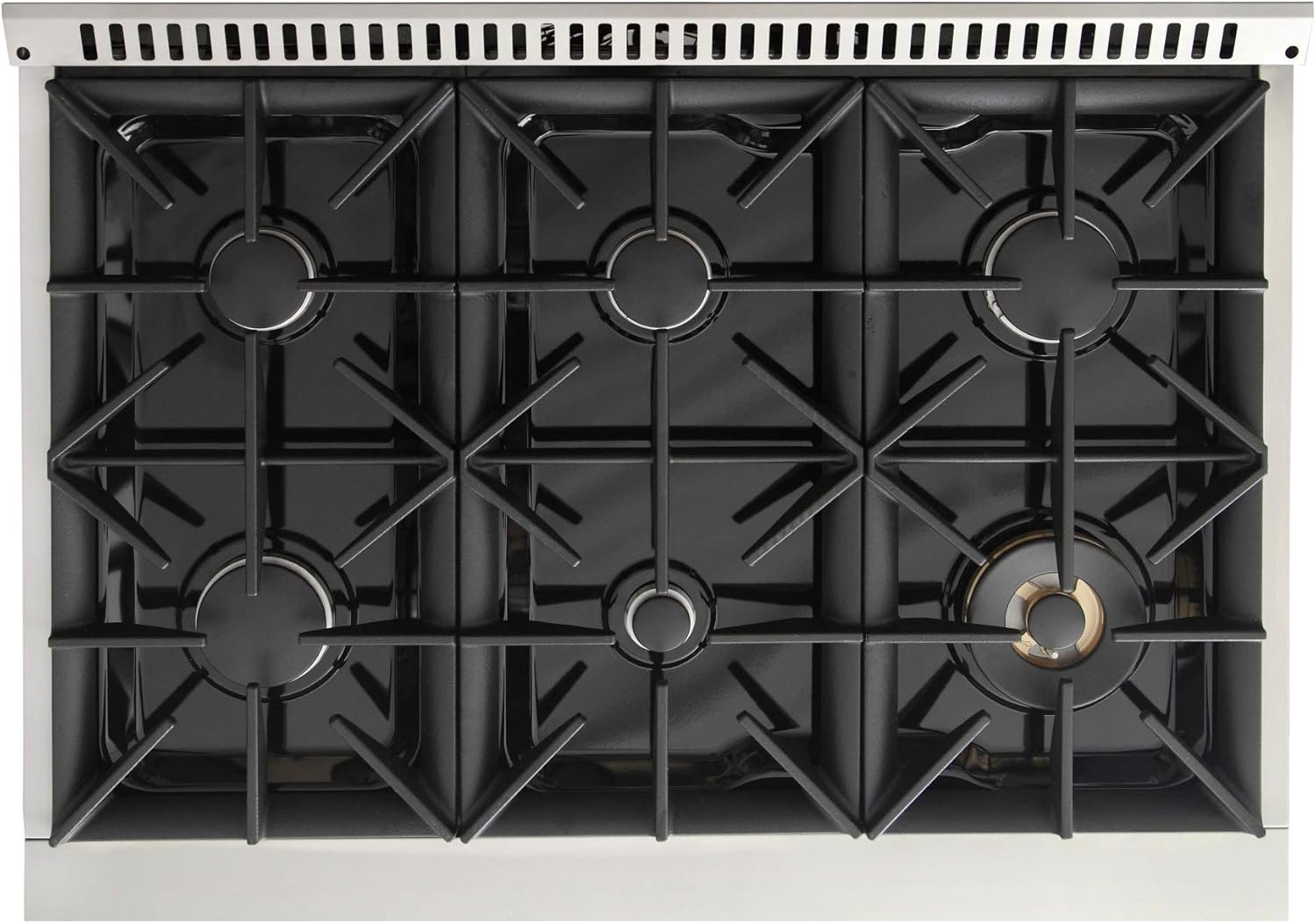 6 burner gas range includes one 20,000 BTU dual burner with simmer, one 15,000 BTU burner, one 12,000 BTU burner, two 9,000 BTU burners and one 6,000 BTU
