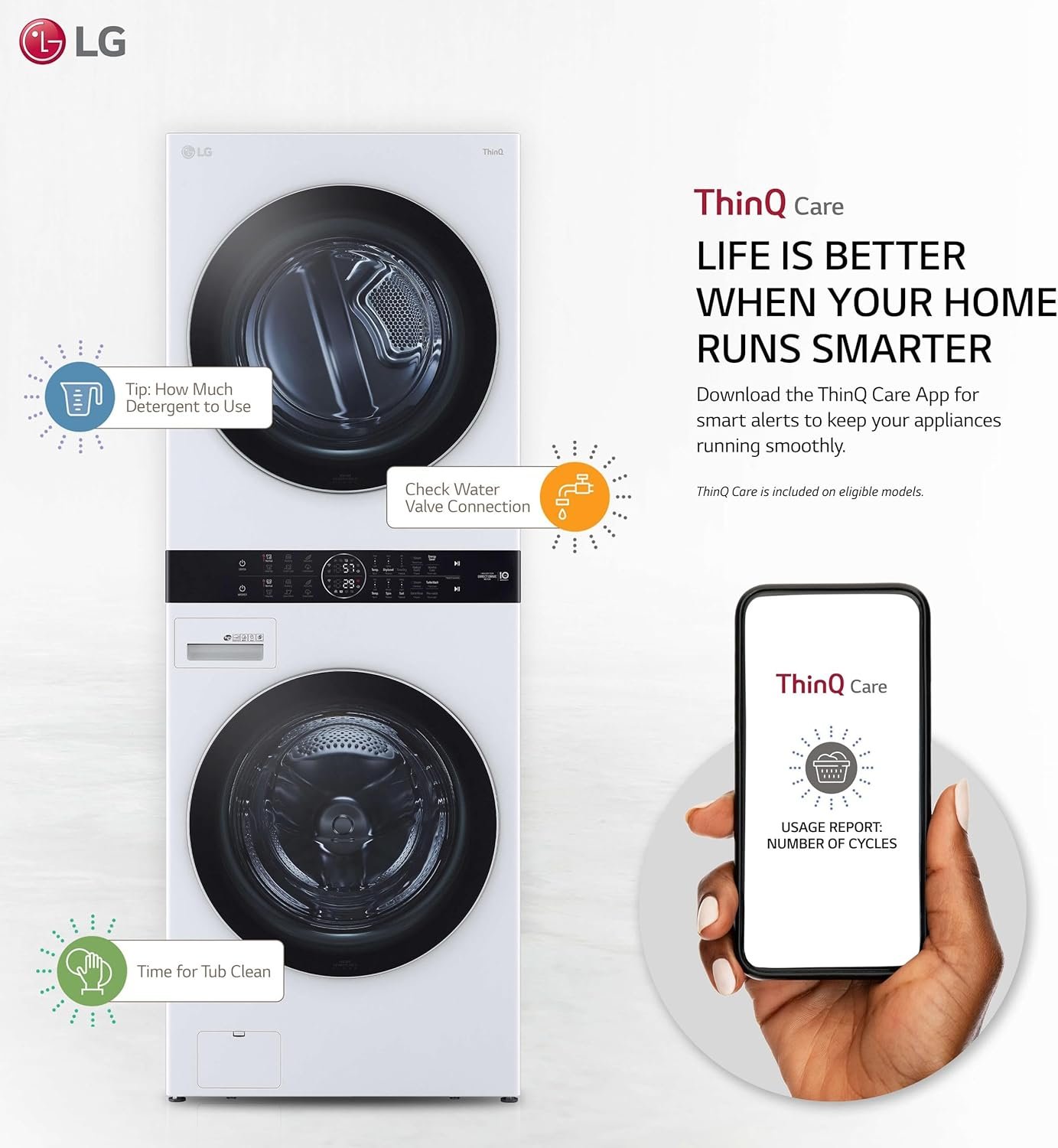 This WKEX200HWA 27″ LG’s Smart Single Unit Wash Tower is an LG innovation built to perform. Able to perform just as well as any washer and dryer pair, the Wash Tower comes as a single unit saving you the hassle of dealing with two separate components. TurboWash 360° uses five powerful jets with variable sprays to give even larger loads a complete clean in under 30 minutes. Built-in intelligence uses AI technology and advanced sensors to detect fabric texture and load size to automatically select the perfect settings. LG’s steam technology gently but powerfully penetrates fabrics to virtually eliminate dirt, odors and wrinkles. Expand the limits of your laundry room with the LG ThinQ app. Select a cycle, start or stop the wash and get notifications about when your laundry will be done, all from your smartphone. It even works with the Google Assistant and Amazon Alexa, so you can manage your laundry with simple voice commands.
