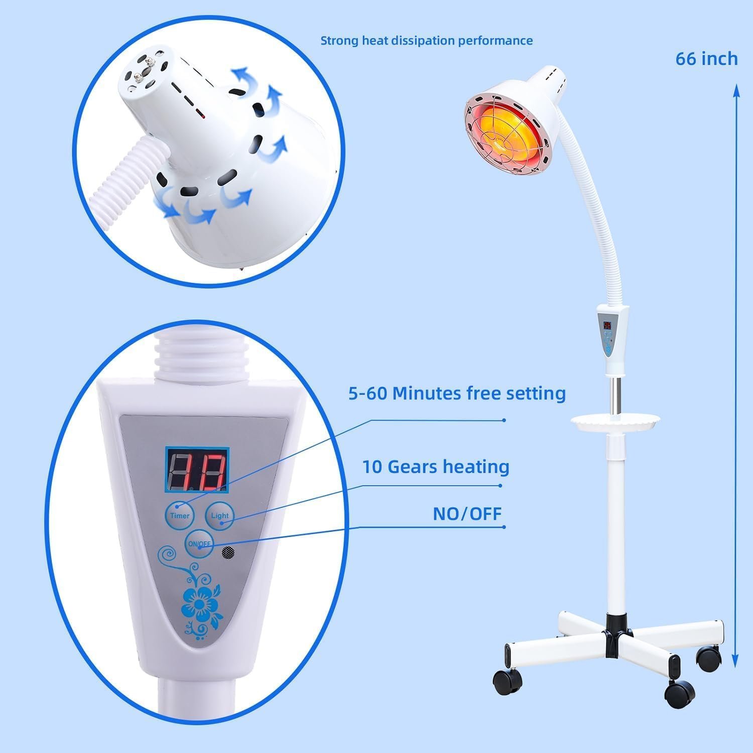 275W INFRARED HEAT LAMP,Infrared light using 275W high-power bulb,temperature can be adjusted freely.360 degree rotation light head, adjusting arms can adjust the angle freely,Floor stand design with 4 movable omnidirectional wheels.