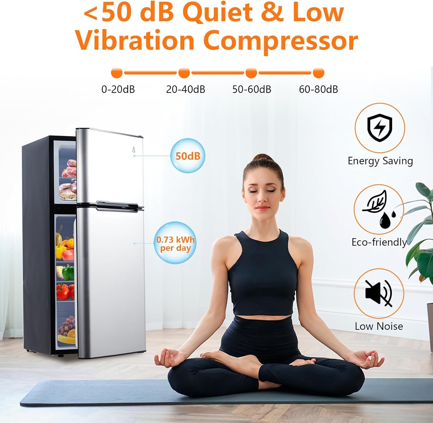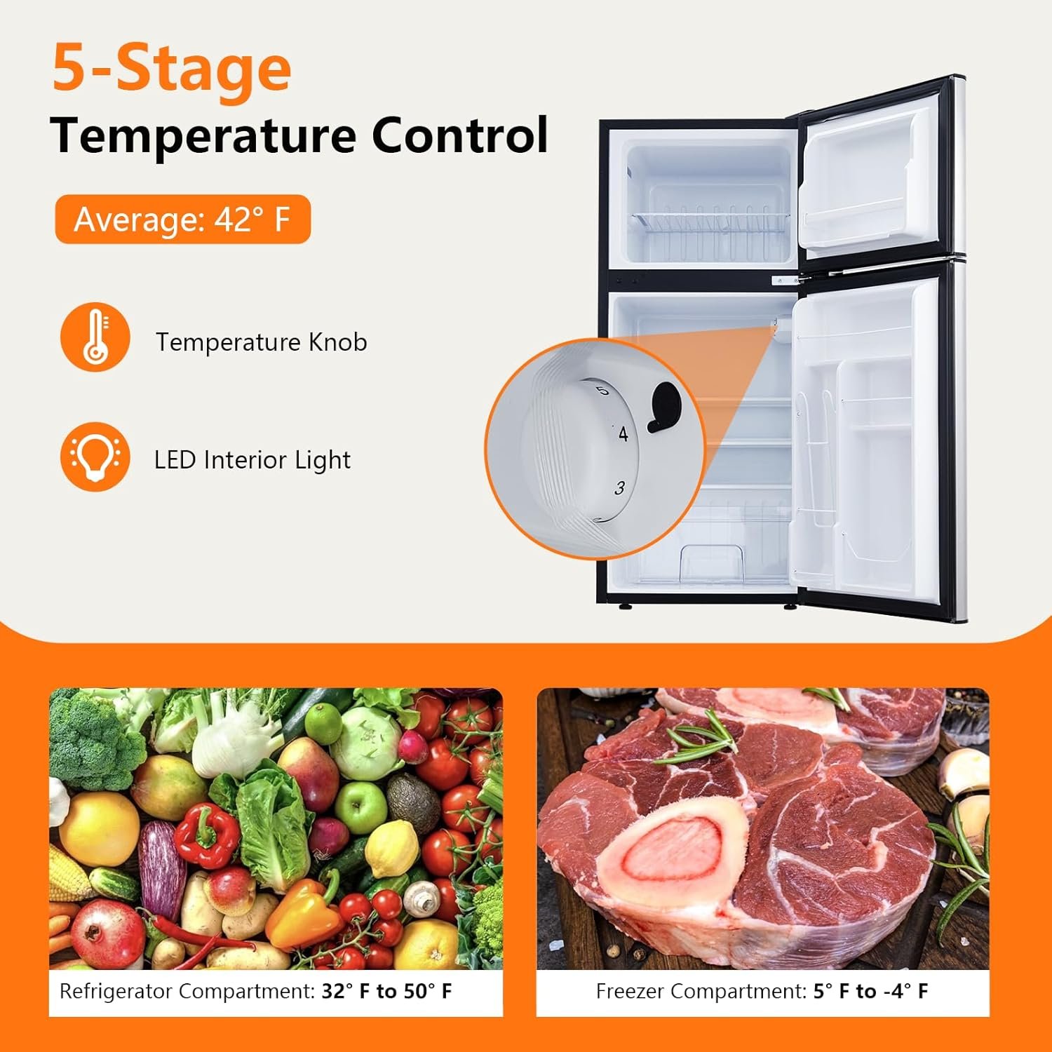 Adjustable Temperature Control: This mini fridge with freezer offers an adjustable thermostat, ranging from 32° F to 50° F, providing 5 variable temperature settings to suit your specific needs. (The recommended temperature range for preserving perishable food is 37 to 41 °F (3 to 5 °C)). The freezer temperature is influenced by the cooler’s settings, ensuring you can select the most suitable temperature to keep food fresh while also saving on electricity costs.