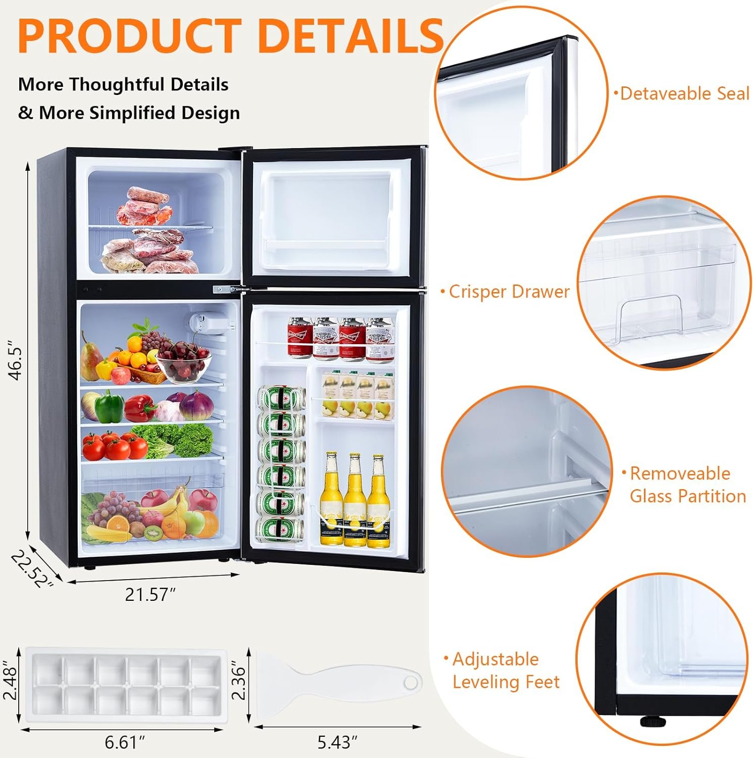 Package Contents 1 x 4.5 cubic feet mini fridge with freezer 3 x removable shelves 1 x crisper drawer 1 x ice tray 1 x user manual