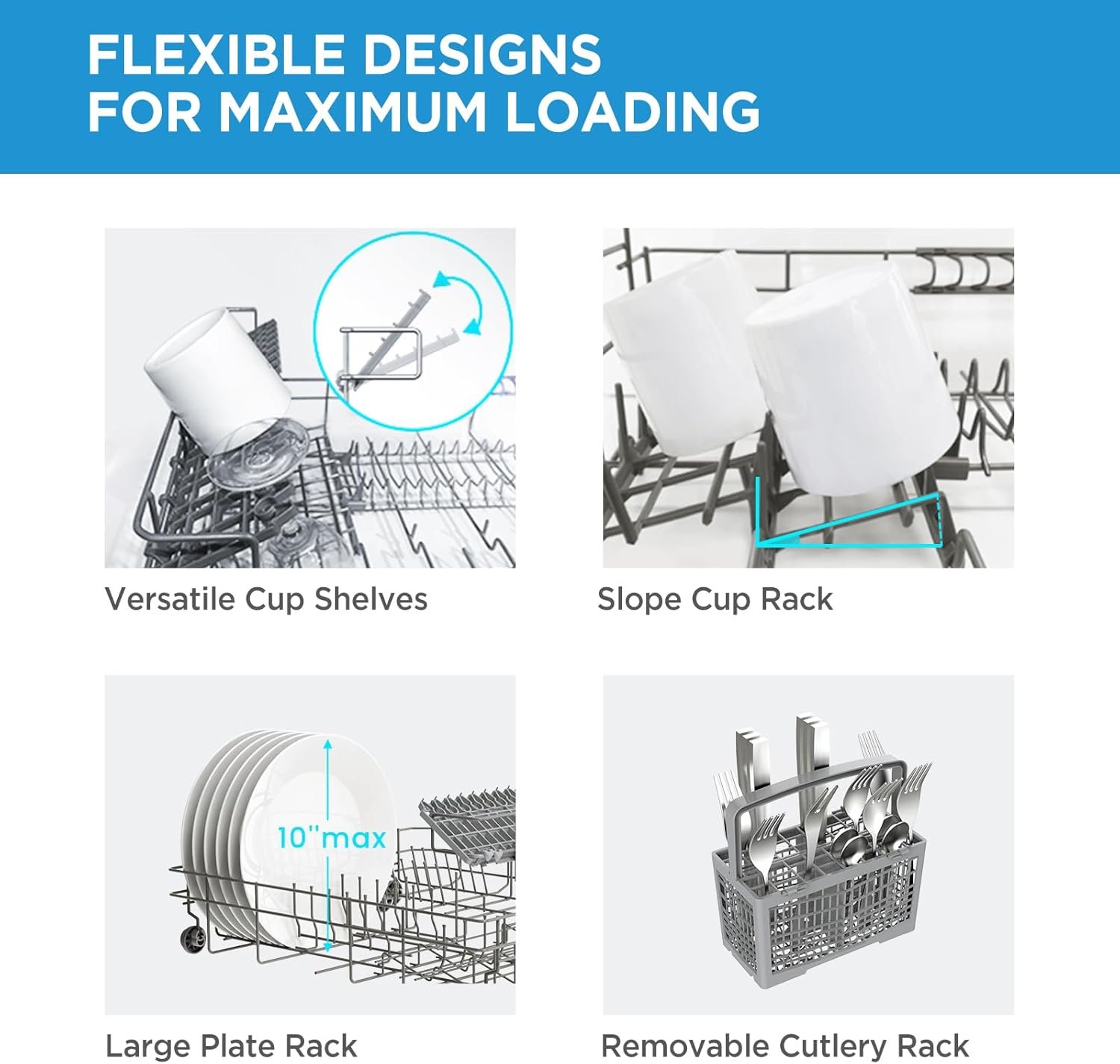 This countertop dishwasher is great; it cleans the dishes really well and itâs quiet too. It is big though, so measure your space beforehand! I like the ability to remove the silverware basket to accommodate larger pans and bowls. The upper racks are not very tall, but they work great for holding spatulas/utensils and cup lids. One drawback I have found is that even on the âExtended Dryâ cycle, plastic items donât get dry⦠but I can live with that.