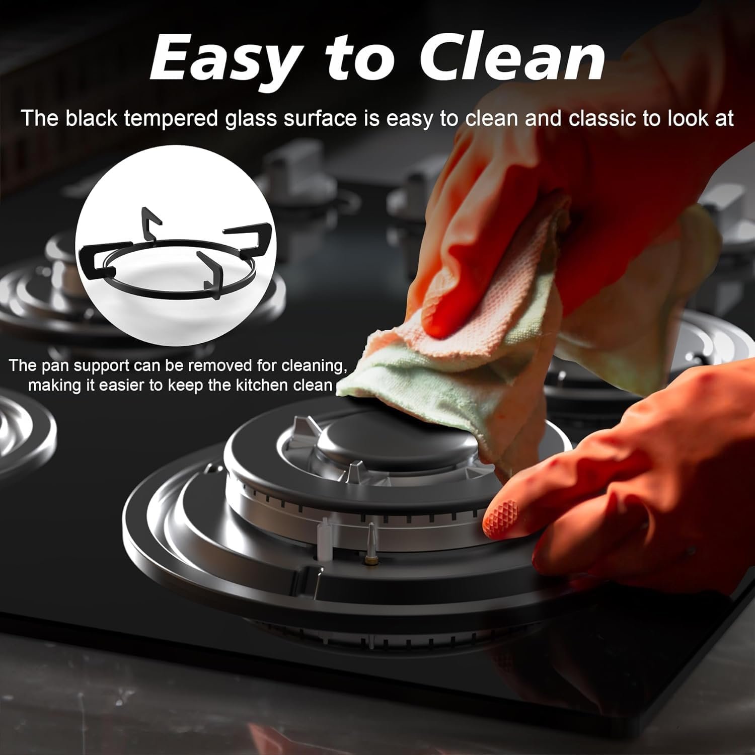 【Modern Aesthetic and Easy Maintenance】Made of highly polished glass with matte enamel support, the glass gas cooktop features preventing rust, high hardness, high temperature resistance, wear-resistant insulation , no discoloration and so on. It’s easy to clean and maintains a sleek appearance even after multiple uses. This makes the gas hob a great option for those who value both style and function in their kitchen appliances.