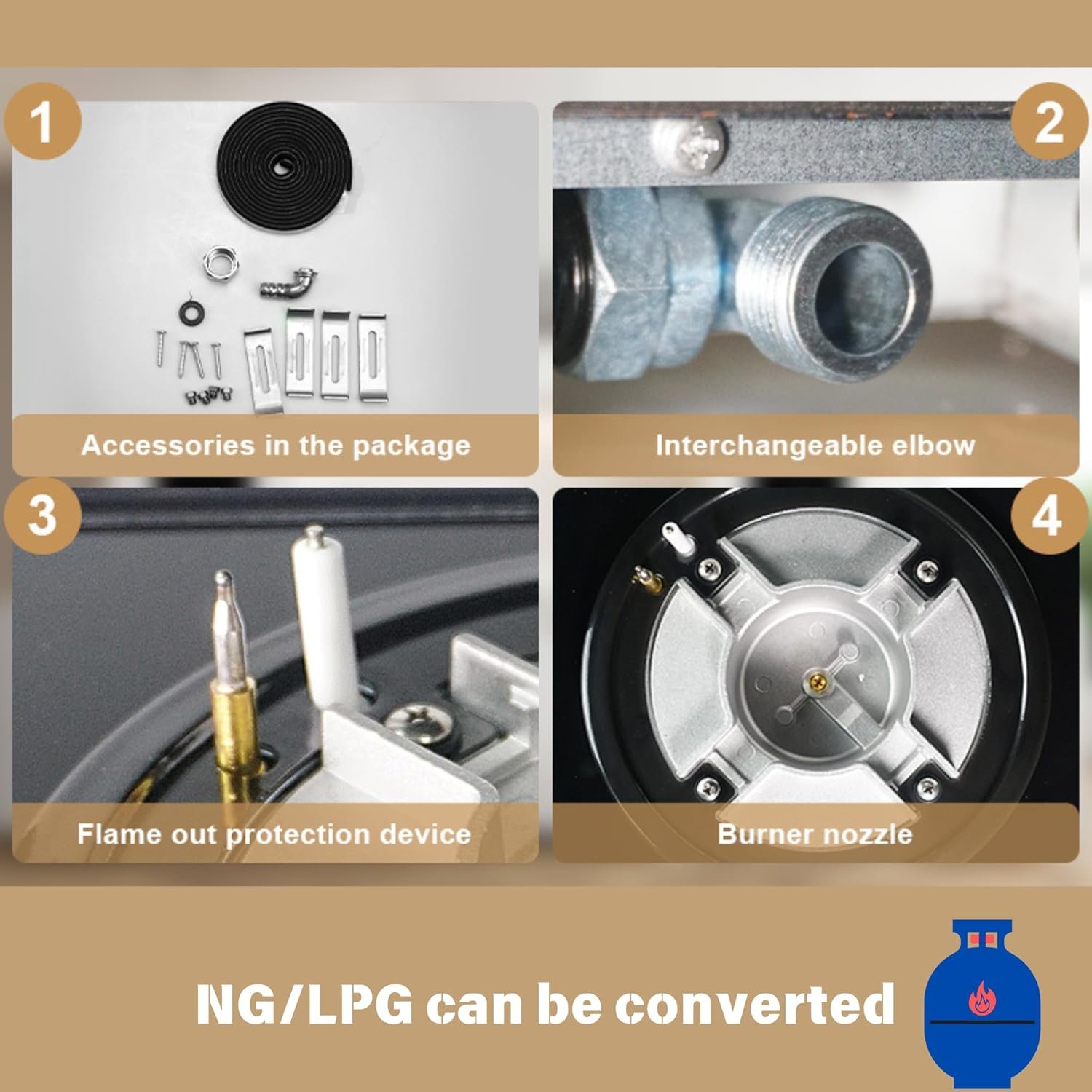 【NG/LPG Dual-Fuel Gas Cooktop】This 12-inch gas cooktop is factory set to use natural gas, but it also comes with the capability to operate on propane (LPG), offering flexibility for different household setups. Included in the package are conversion kits that allow users to easily switch from natural gas to propane. Simply replace the natural gas nozzles with the propane nozzles provided, and you’re ready to cook with your preferred fuel.