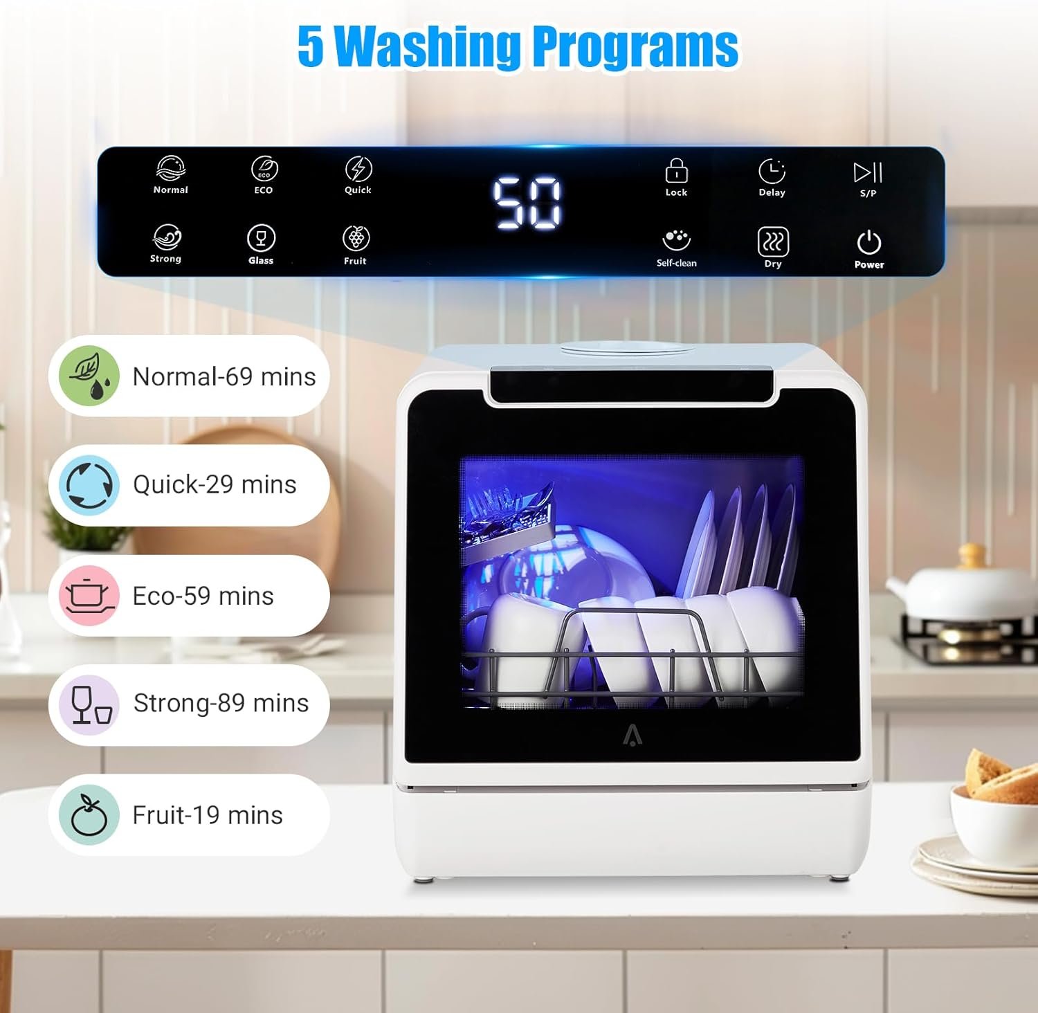 Portable Dishwasher Countertop with 5L Built-In Water Tank, 5 Wash Programs