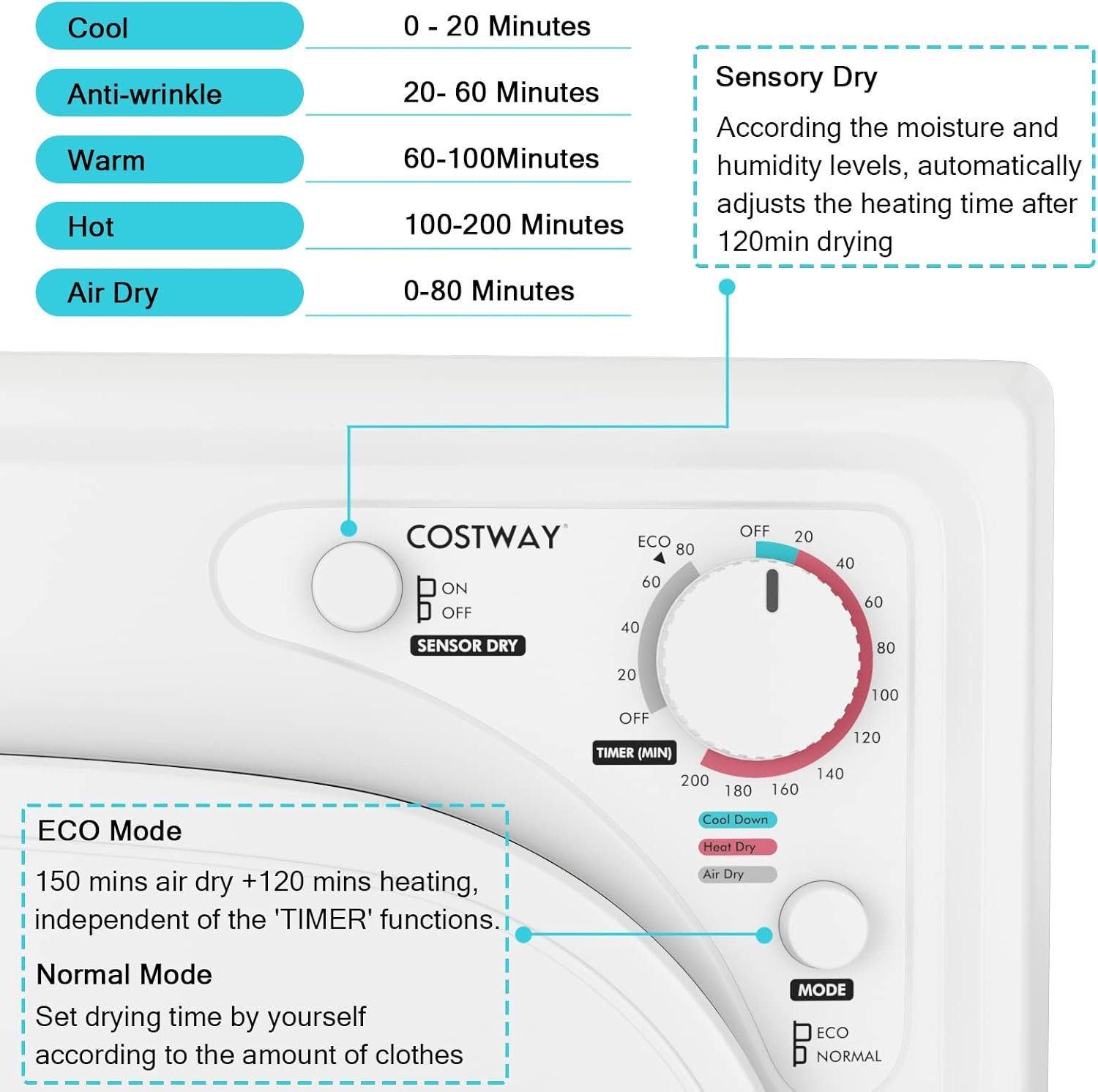 2 modes (normal/ECO) and 4 drying programs (cool/anti-wrinkle/warm/hot/air dry) for your selection