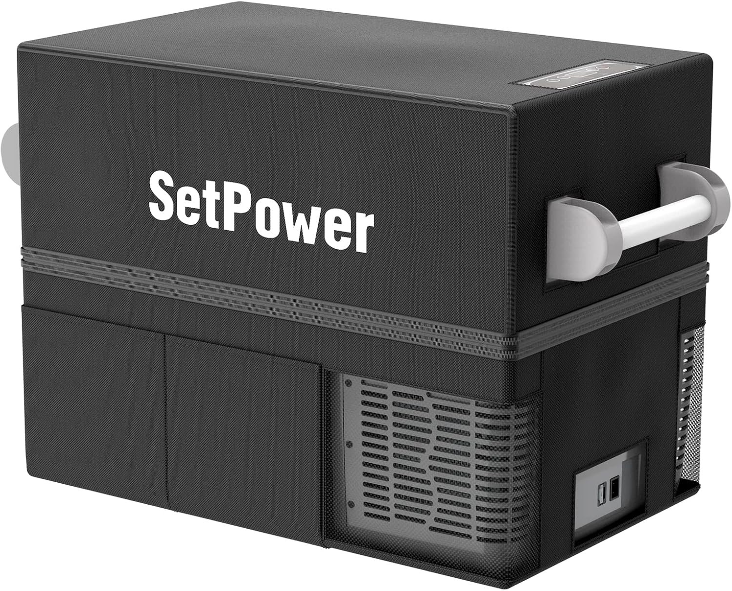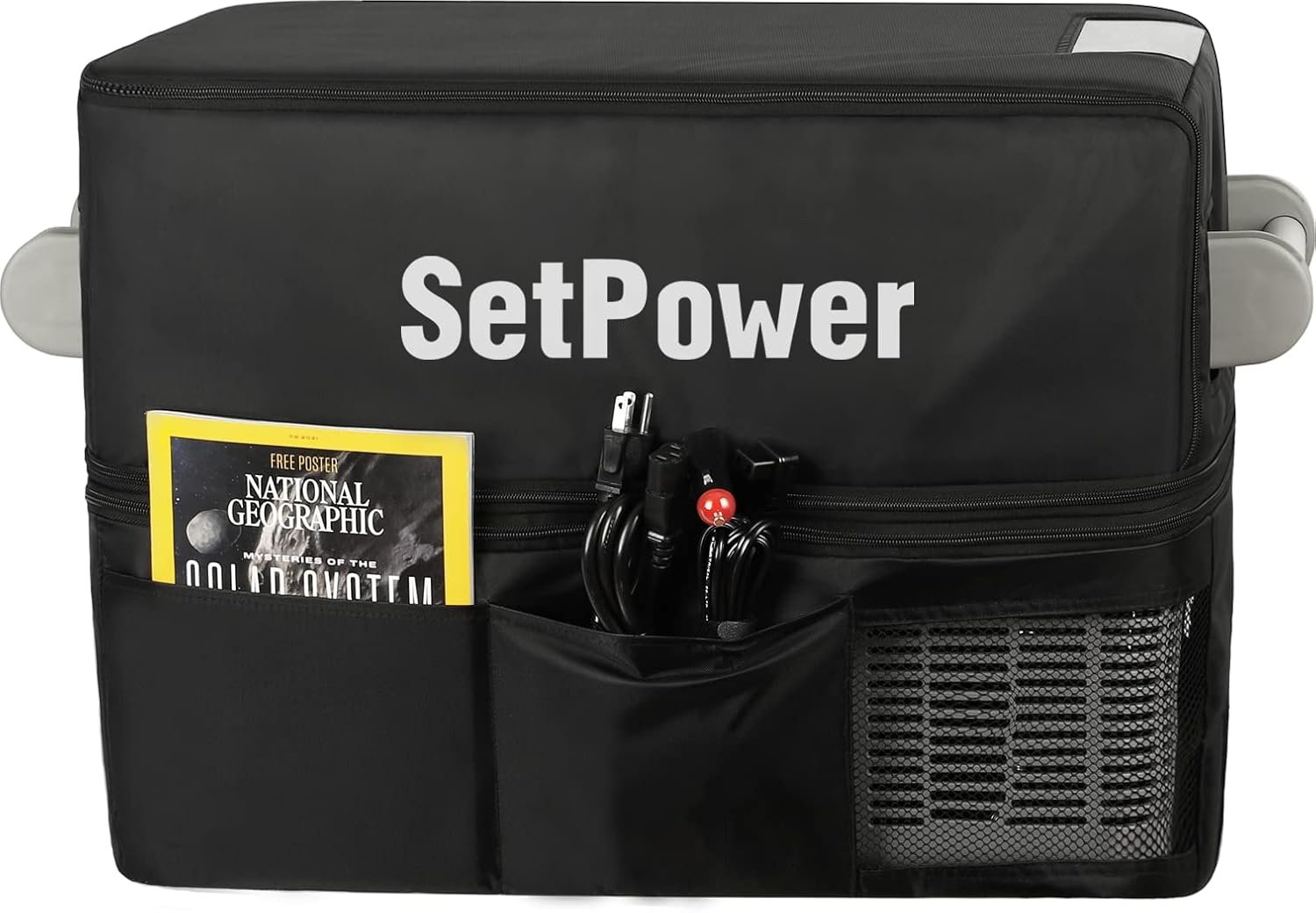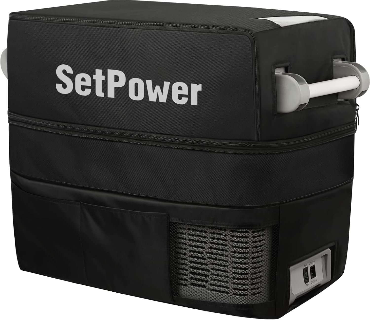 Perfect fit SetPower AJ40 compact refrigerator. It’s a flexible cover and will fit AJ50 if expanded the hidden zipper. Extra insulation protection improves thermal insulation performance and reduces power consumption which saves battery power, improves overall efficiency. Good ventilation without blocking airflow, transparent window, and control temperature. High-quality oxford nylon fabric, extra insulation against extreme outside temperatures dirt, dust & sand. Keeps your fridge like new even in harsh conditions.
