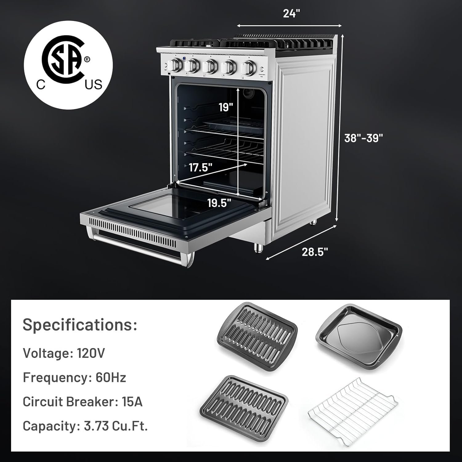 Family Oven Capacity & Storage Drawer: Provides 3.73 cu.ft. cooking capacity thatβs perfect for multiple dishes at once. Adds additional storage space thatβs perfect for pots, pans and baking sheets.Product size: 24″Wx 28.5″D x 38″-39″H, Cutout Size: 24 in. W x 26 in. D x 39 1/5 in. H. Pre-installed for natural gas (gas regulator included), Can be converted to liquid propane gas use (LPG conversion nozzles included). Pre-installed US standard 120v GFCI power cord (electric ignitor