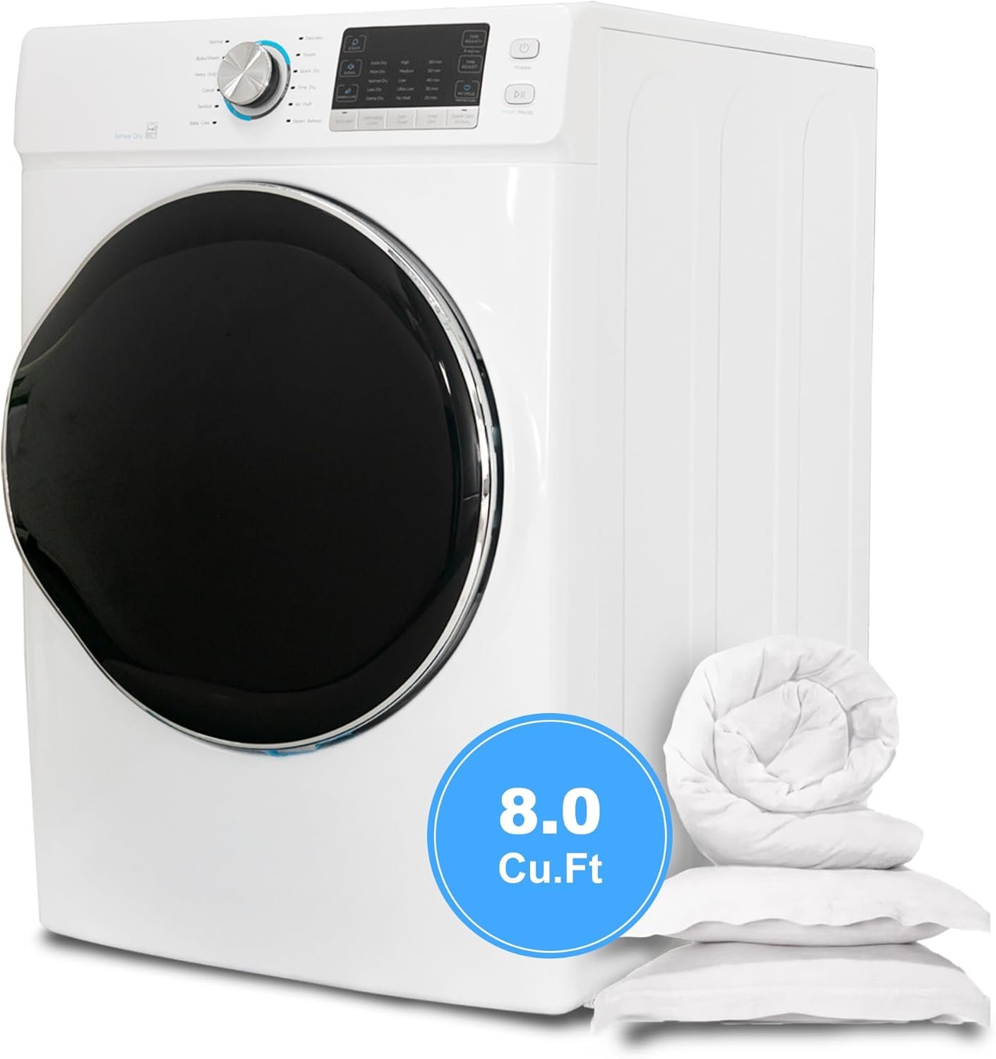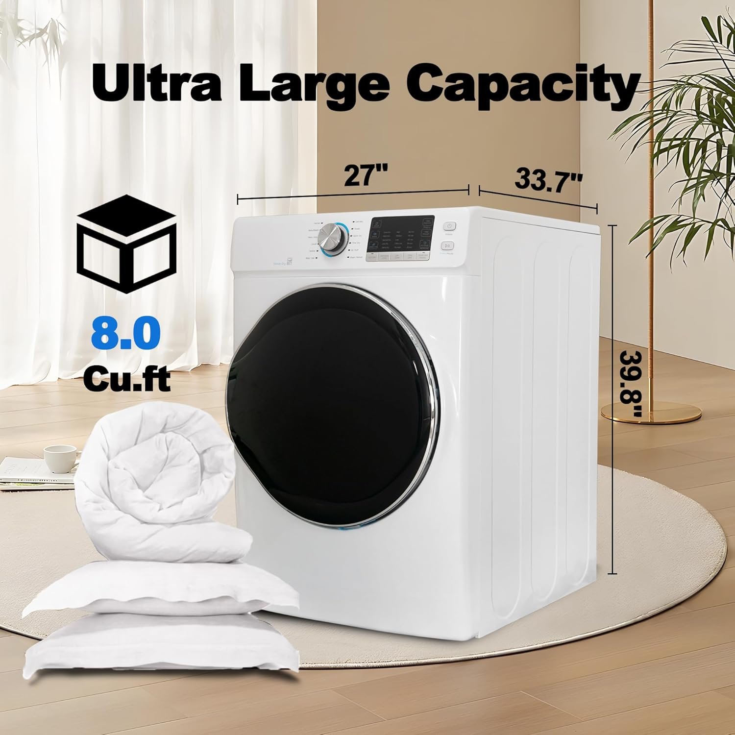 Full Size and Large Capacity:The electric dryer machine has a ultra large capacity of 8.0 cu.ft, enough for the daily drying use of a family. The size of the clothes dryer is: 27”W*33.7”D*39.8”H. You can build in, freestanding or stack it