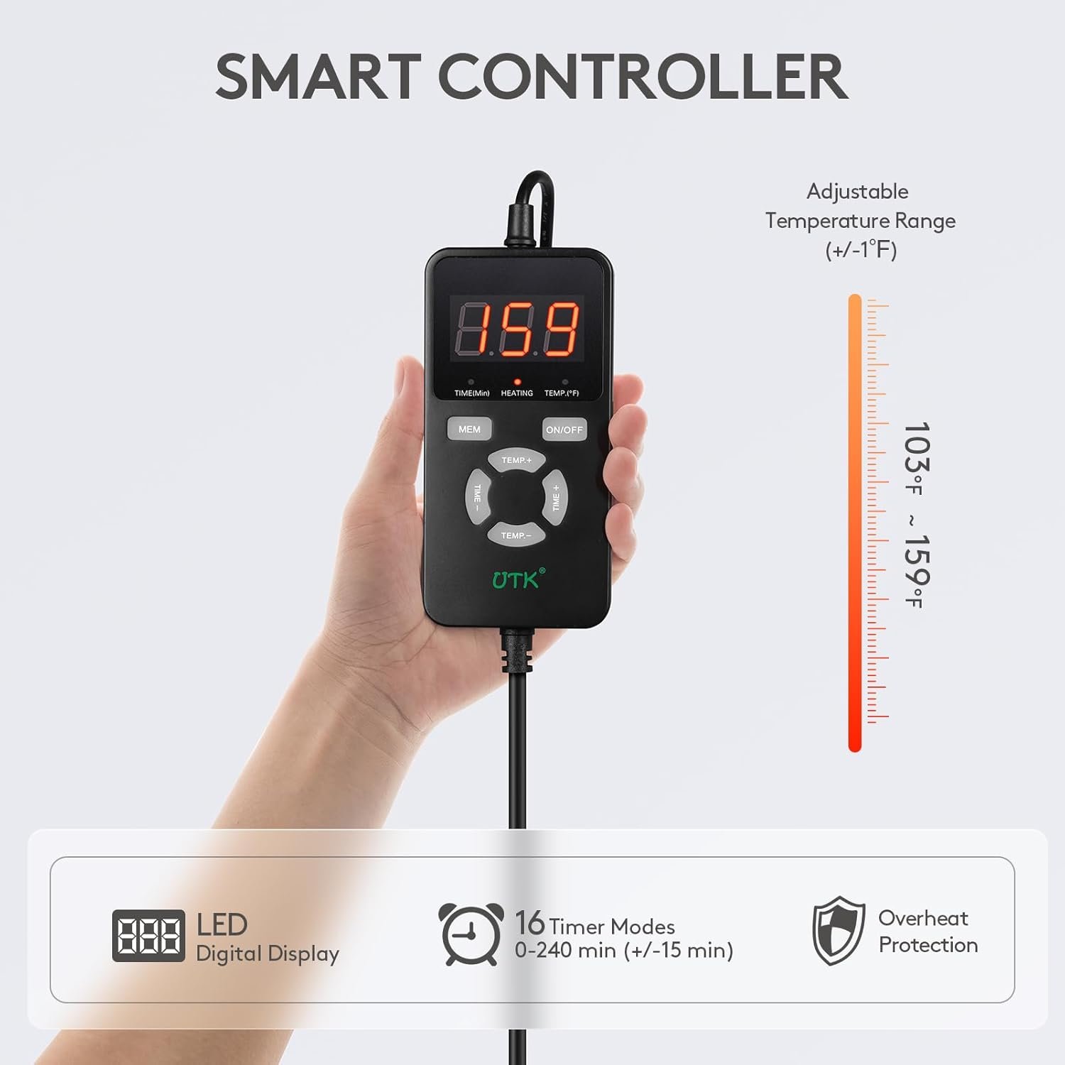 【Smart Controller / Temperature】- 103℉-159℉, 4 hours auto shut off.