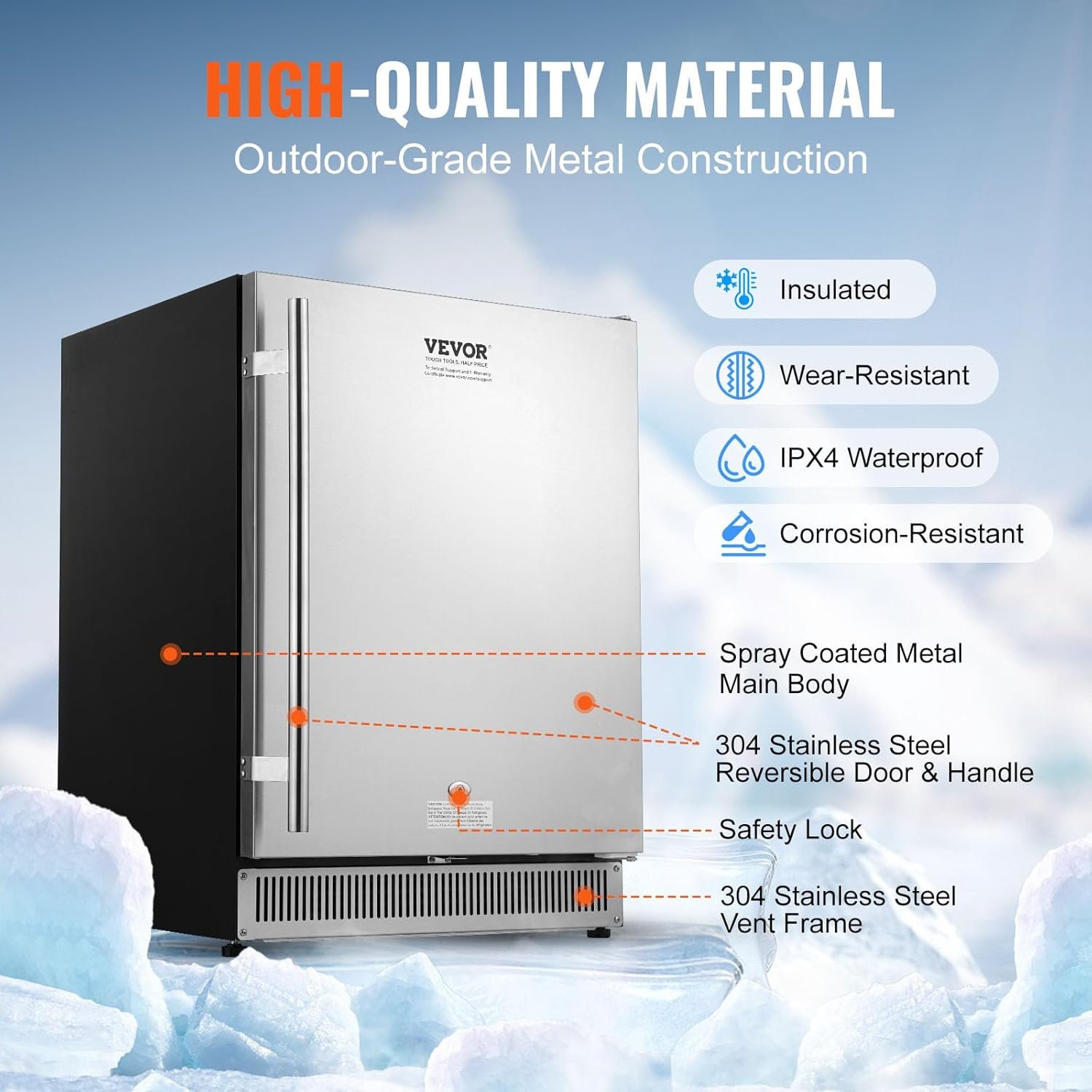Our outdoor fridge boasts a robust thick stainless steel door for exceptional durability and resis-corrosion. Its user-friendly features include a lockable, reversible door, adjustable shelves, and height-adjustable feet. Elevate your outdoor experience with this stylish and versatile refrigerator