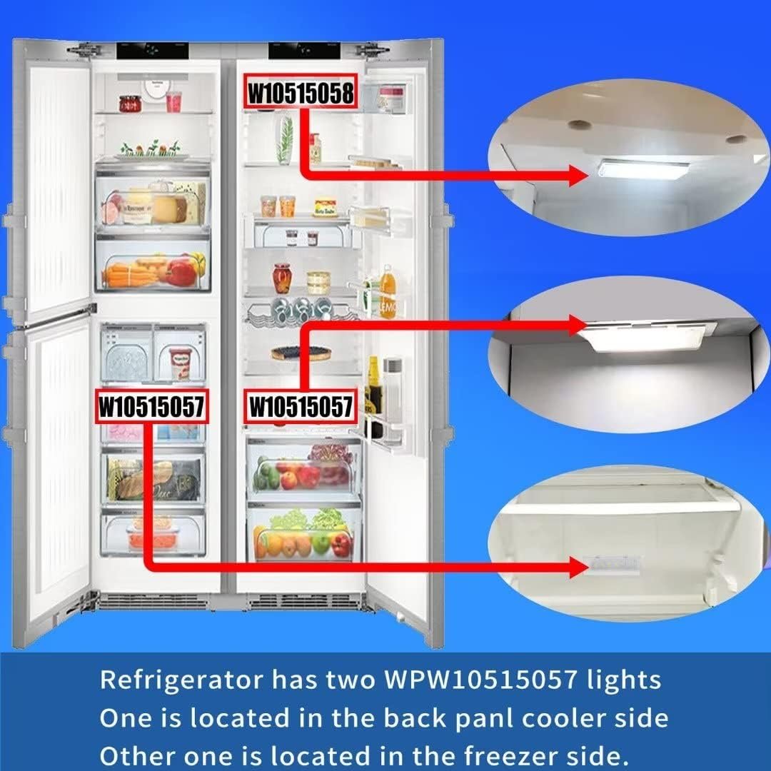 ♧There are two of these lights used in your refrigerator. One is located in the back panel cooler side, the other one is located in the freezer side. The led light located on the ceiling is main led board W10515057, you need to make sure the main board works well before replacing any of the other two ligths, the secondary light are being fed power thru main led light. If main led does not work, the secondary led will not work.