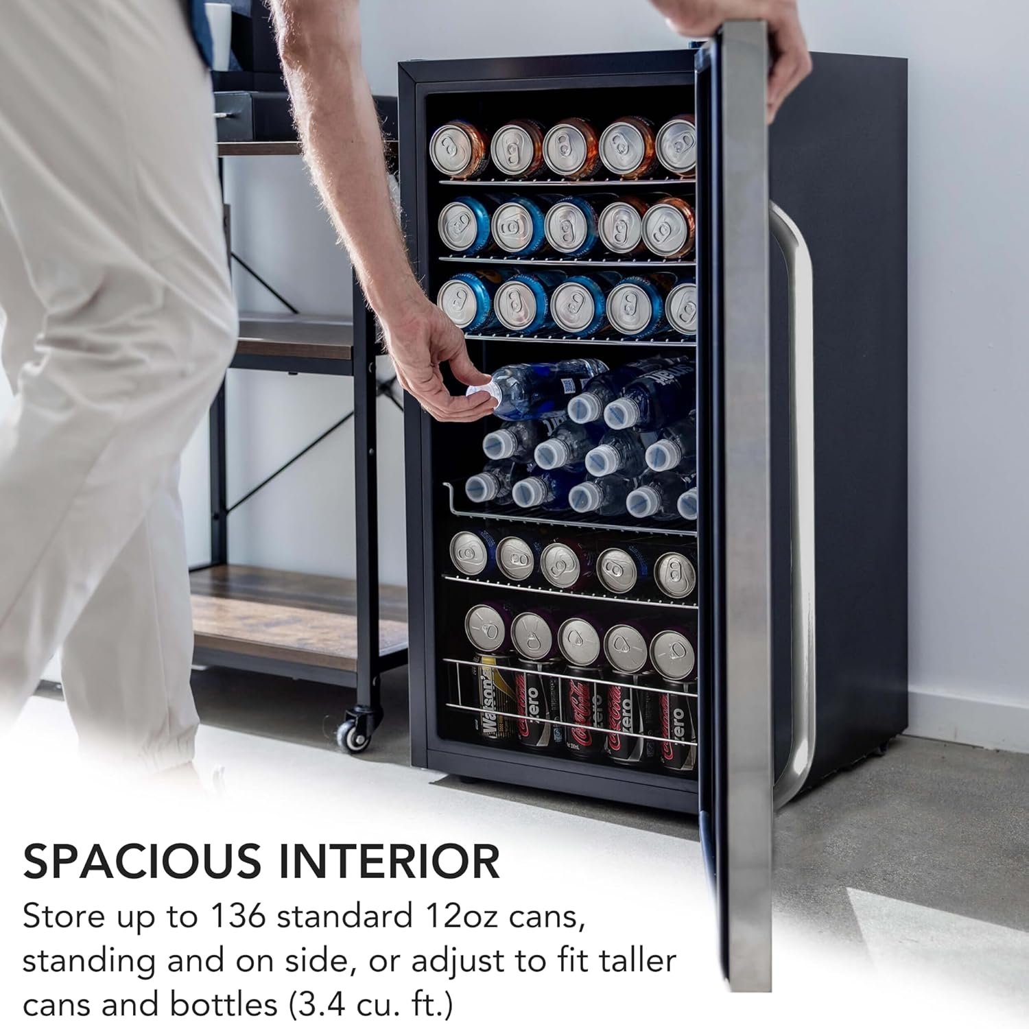 Award-Winning Small Refrigerator: Food & Wine Magazine’s “BEST FREESTANDING” beverage fridge, it features 3.4 cu. ft. of storage capable of cooling up to 136 standard 12-oz. cans while standing, but the shelves can be adjusted to fit taller bottles
