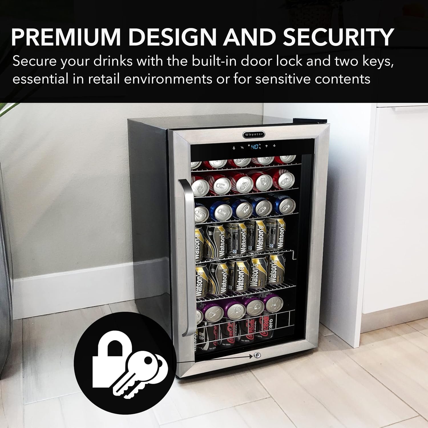 Sleek, Secure Storage: Our mini refrigerator features an energy efficient double-pane glass door for UV isolation; With a black cabinet, stainless-steel trim, and a built-in lock, this beverage refrigerator with glass door secures beverages in style