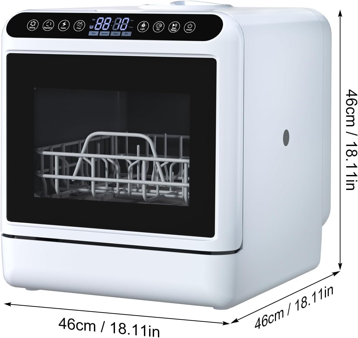 Thin Body with Large Capacity:The counter top dishwash features a stylish and slim design that takes up less countertop space, making it perfect for small kitchens. Despite its small size, it has a carefully designed 2-layer shelf with 5 positions that can accommodate over 40 pieces of tableware. Very suitable for families with 5-6 members, it can also accommodate 11.8 inch plates with the upper basket removed